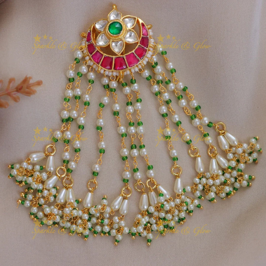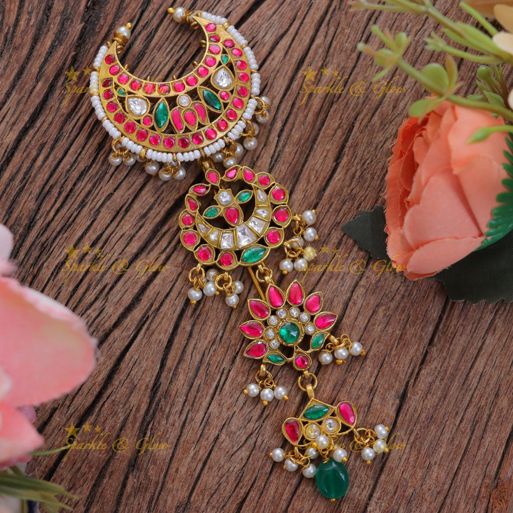 Whether you choose the Lakshmi Jadau Half Moon Hairpins or the Floral Jadabilla Hairpieces, each accessory is designed to help you feel special. The antique gold tones and pearl details add a vintage touch that complements sarees, lehengas, and Indo-Western outfits beautifully.