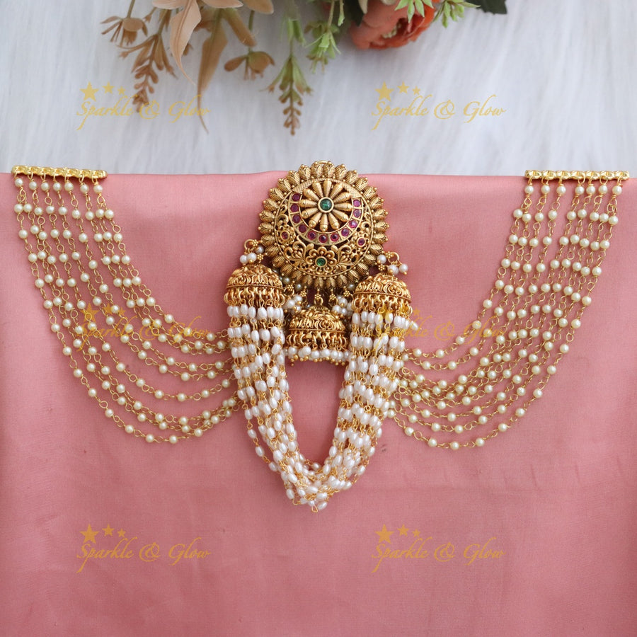 Whether you choose the Lakshmi Jadau Half Moon Hairpins or the Floral Jadabilla Hairpieces, each accessory is designed to help you feel special. The antique gold tones and pearl details add a vintage touch that complements sarees, lehengas, and Indo-Western outfits beautifully.
