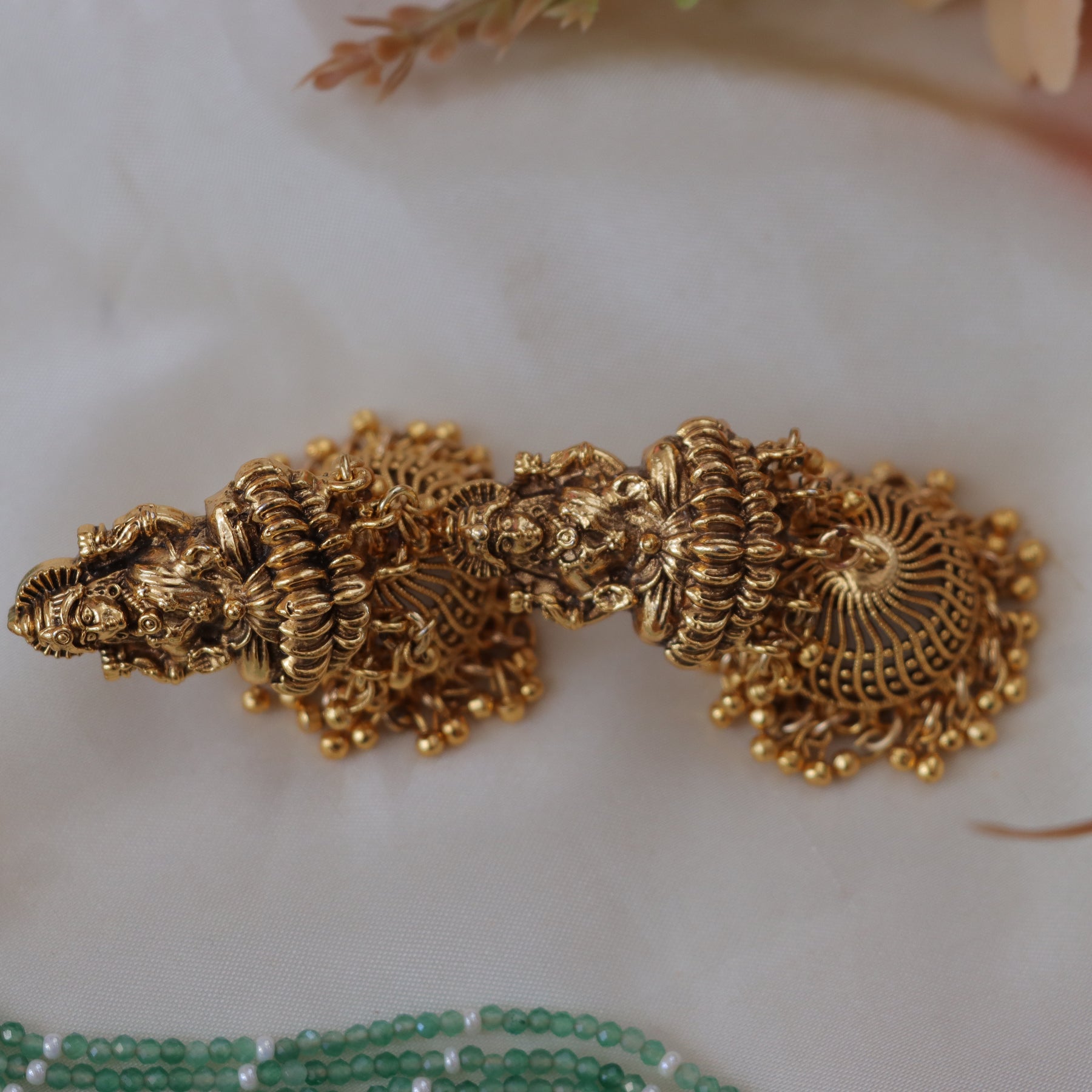 - Gold-finished pendant with Lakshmi and peacock motifs