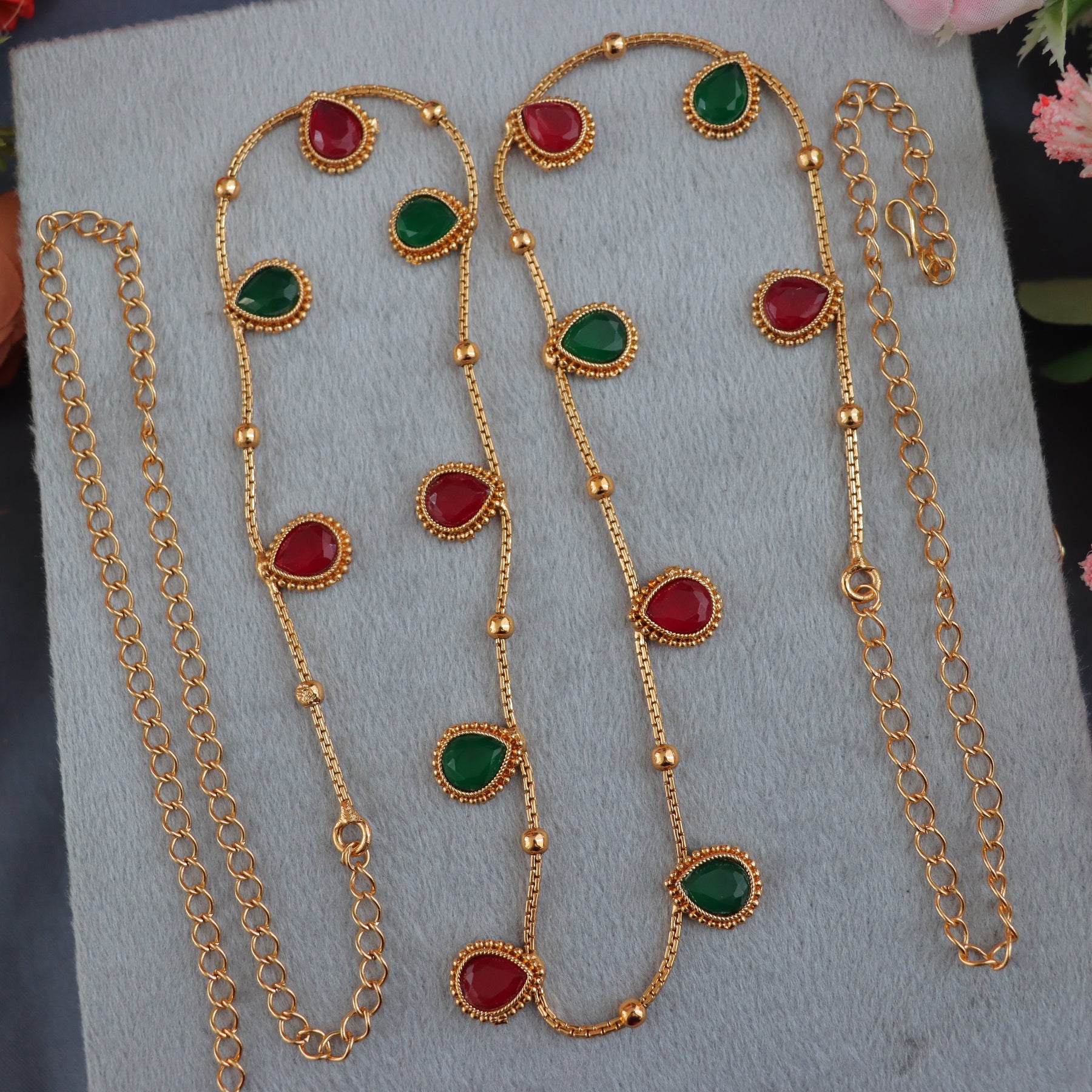 The design incorporates the finest materials to ensure a rich, luxurious feel while maintaining comfort and durability. The blend of red and green stone drops set against the gold chain creates a harmonious contrast, perfect for pairing with best-selling jewelry pieces or your favorite saree. Not only does this piece serve as a visual delight, but it also represents a blend of cultural heritage and contemporary fashion.