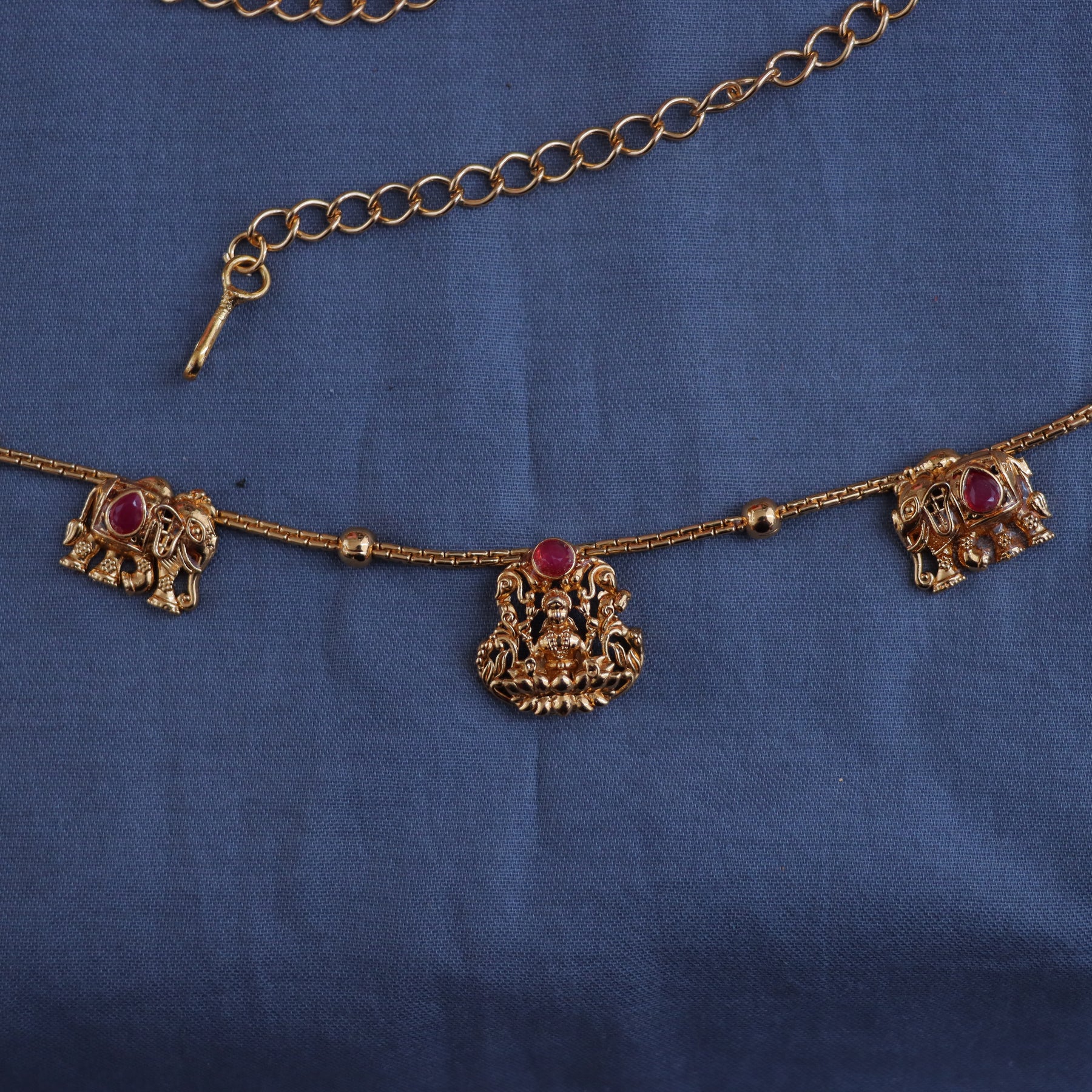 The hip chain features intricate motifs of Lakshmi and elephant designs, symbolizing prosperity and strength. Each motif is meticulously crafted with a gold finish, providing an authentic and luxurious look. Adorned with beautiful red stones, the chain captures the essence of opulence and sophistication.