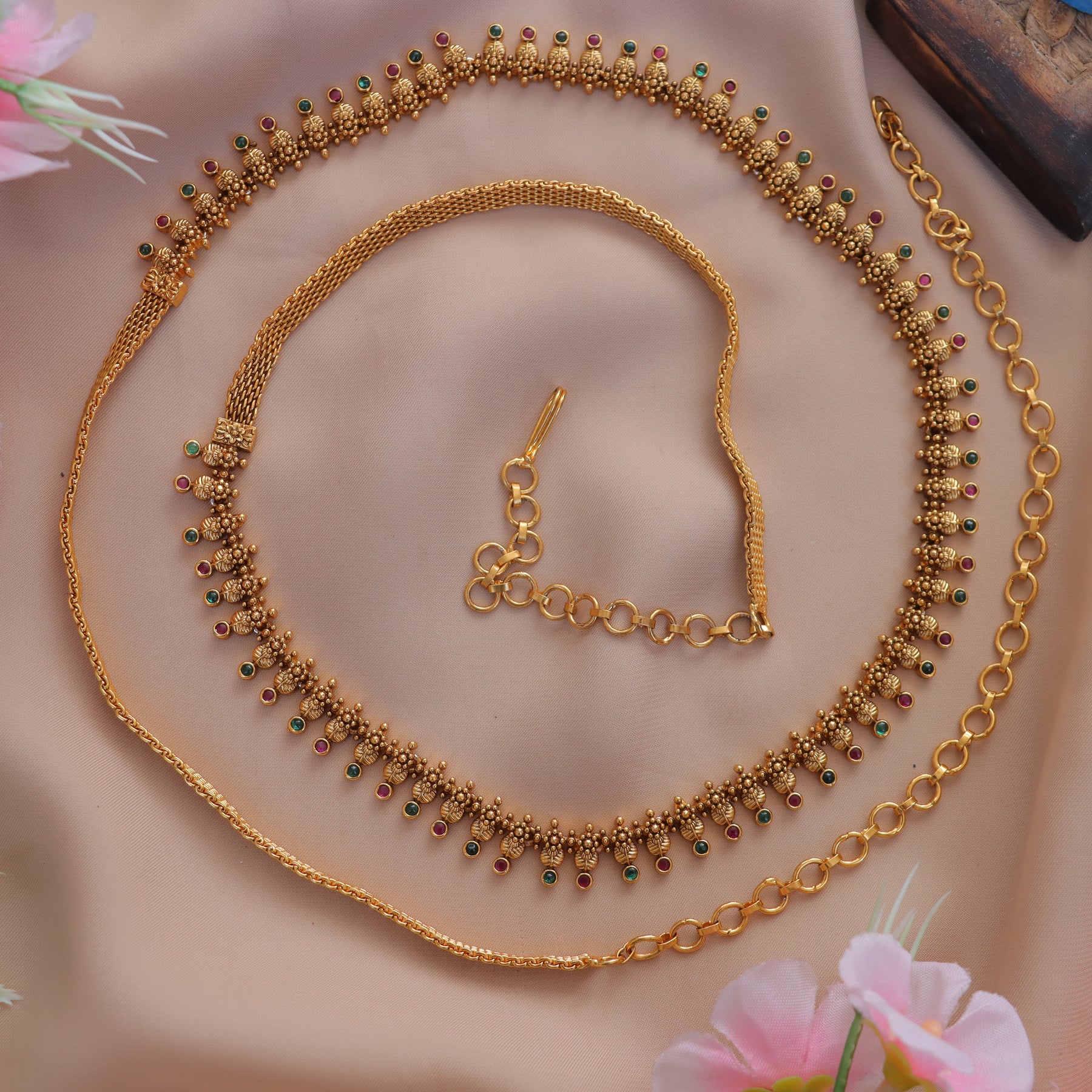 Embrace the elegance of traditional Indian crafts with our Exquisite Wedding Gold Hipchain. This masterpiece of imitation jewellery is designed to bring a blend of heritage and contemporary styles to your festive wardrobe. Made with high-quality materials, this hip chain emulates the grandeur of real gold with its intricate detailing and polished finish.