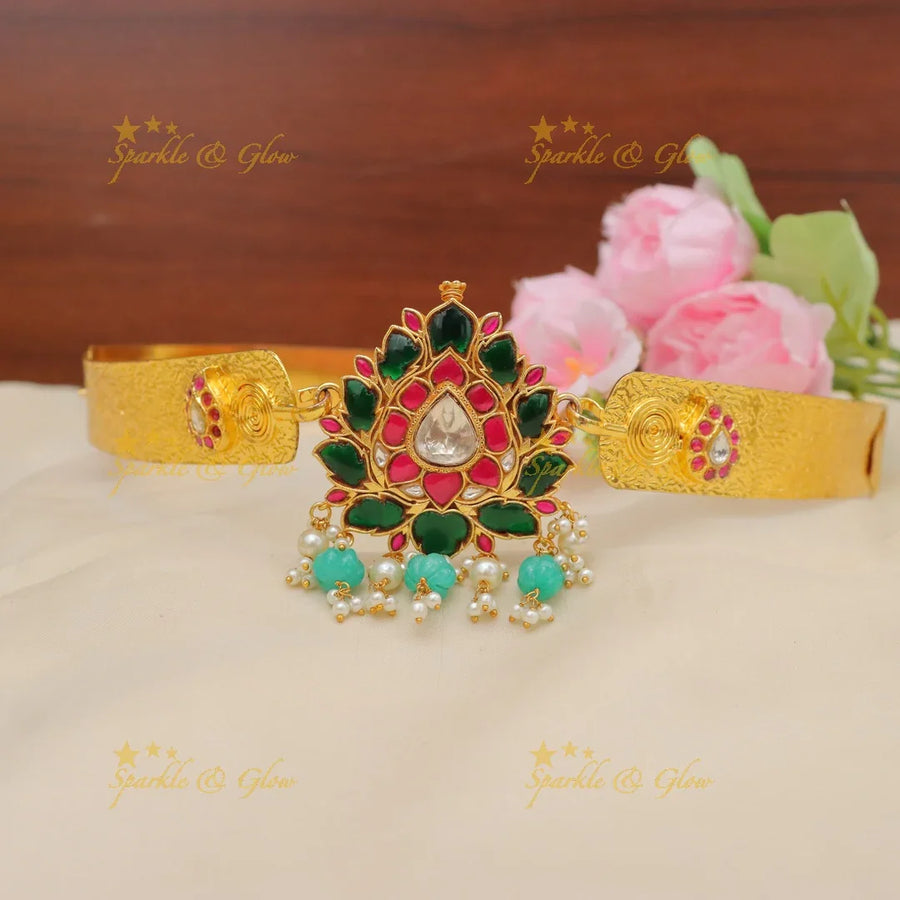 Choose from pieces like our newly arrived White American Diamond stones two tone peacock hipbelt available in vibrant shades of Green and Pink. Or the statement making Gold alike non idol kemp hipbelt adorned with green beads, meticulously designed to add a touch of festivity to your traditional attire.