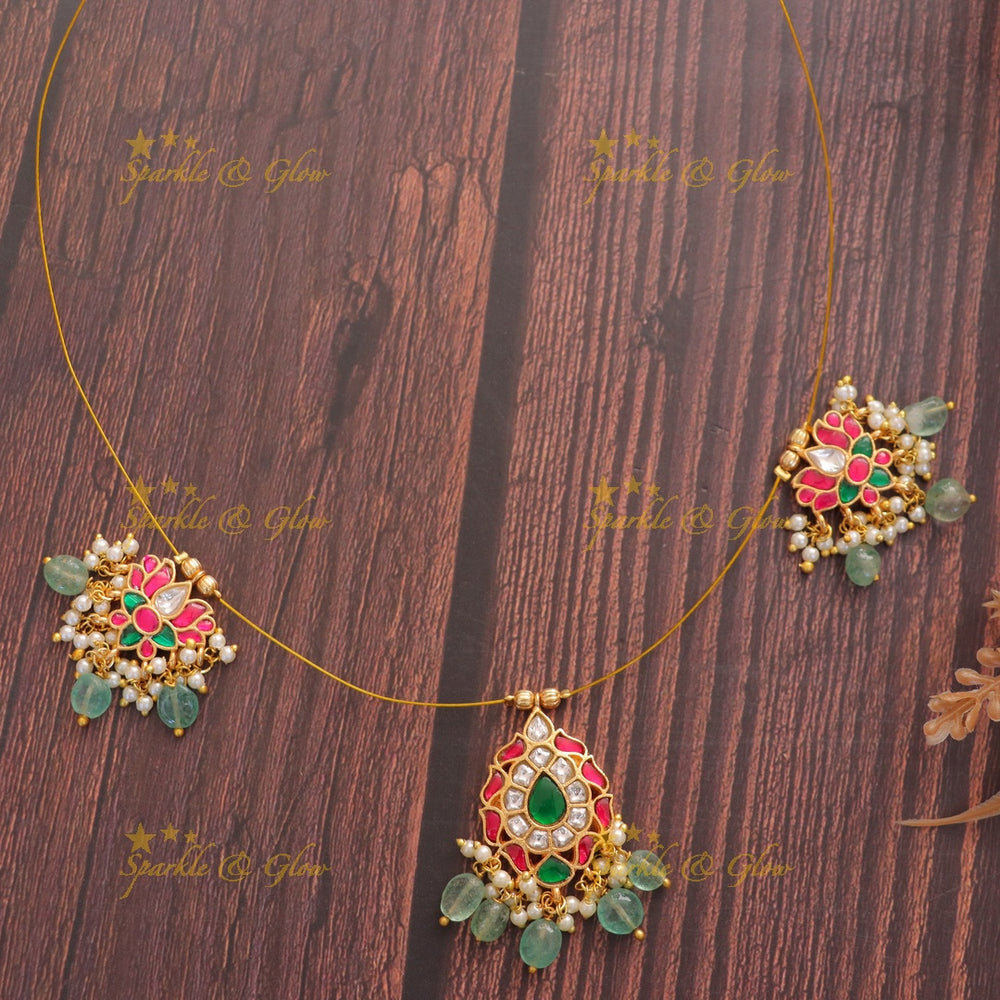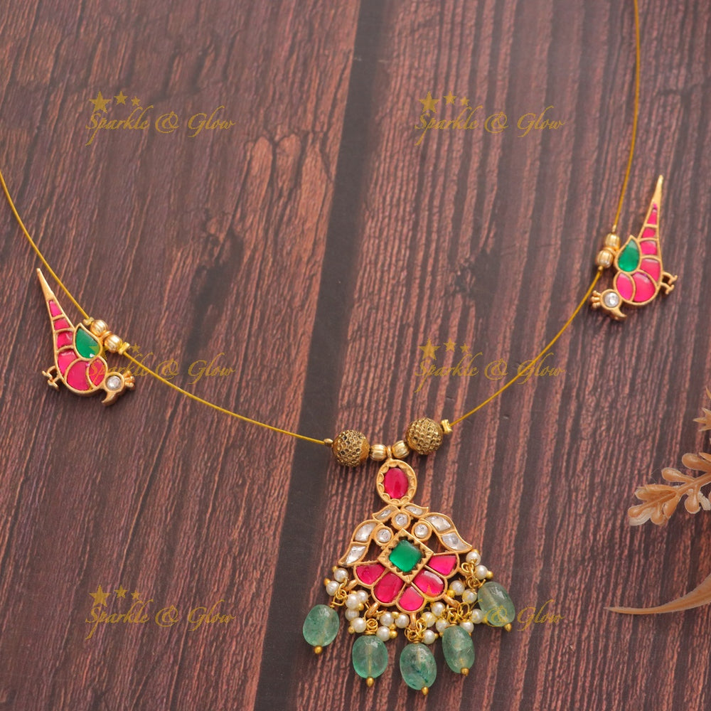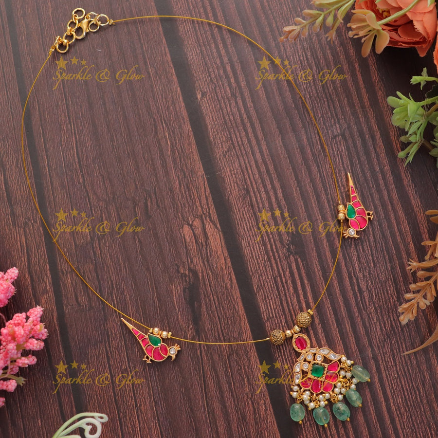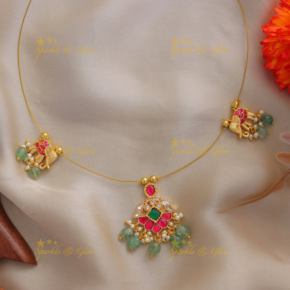 Also included in this collection are pieces like the Elegant Lotus Floral Guttapusalu Short necklace- Blue, and the Gracious Lotus Floral Guttapusalu invisible layered necklace-Ruby. These necklaces feature the auspicious lotus motif, known for its association with divine beauty and purity in Indian culture. The floral guttapusalu design, a traditional style from South India, adds a charming touch to these necklaces, making them the perfect accessory for festive occasions.