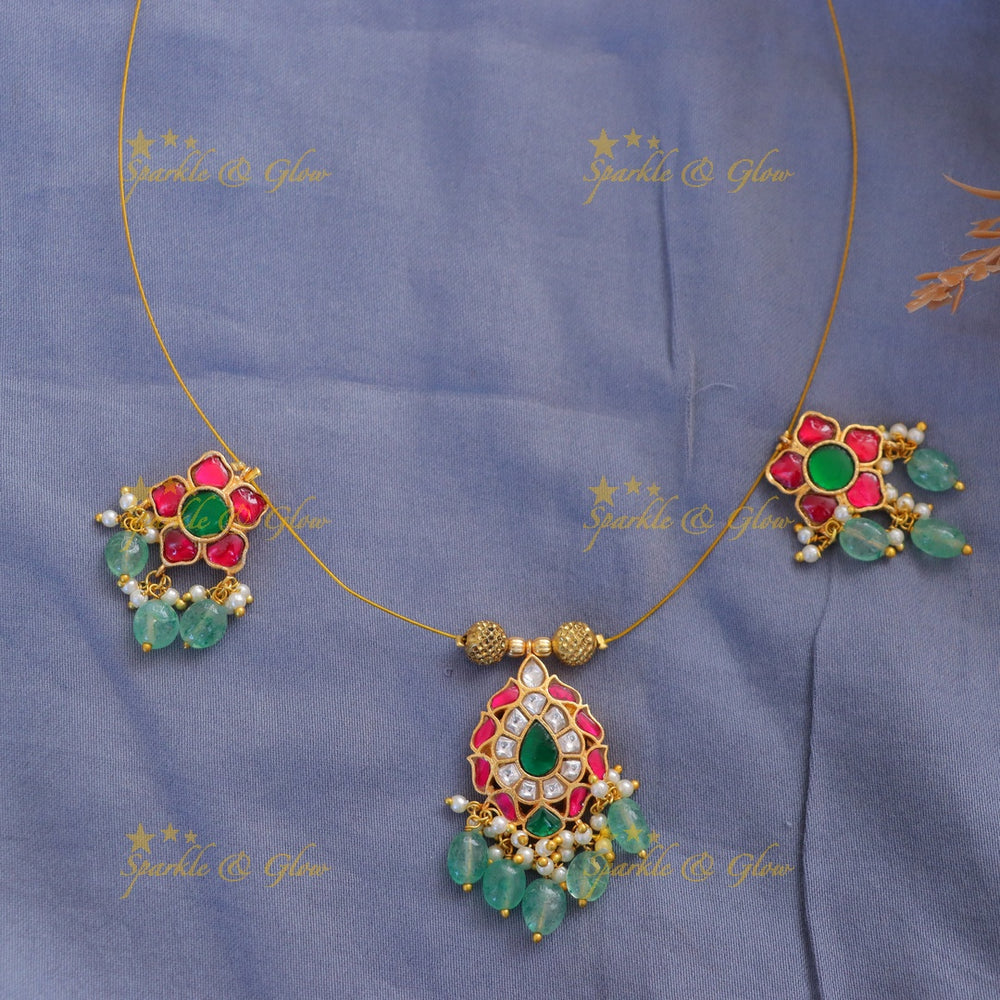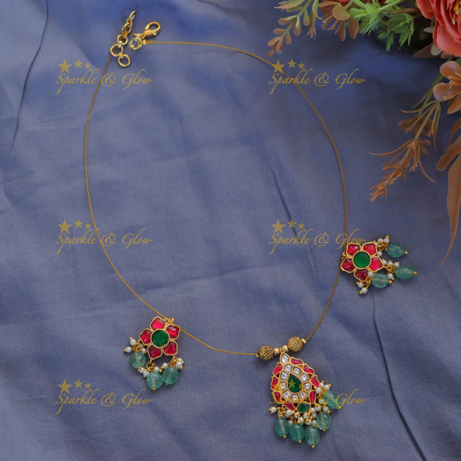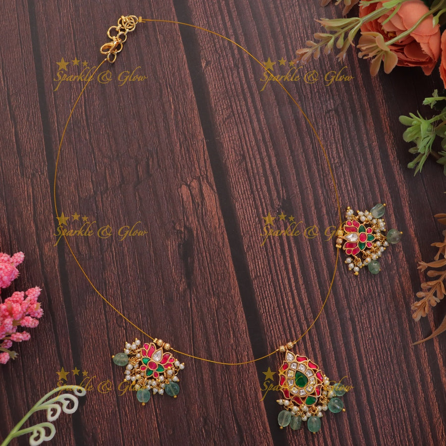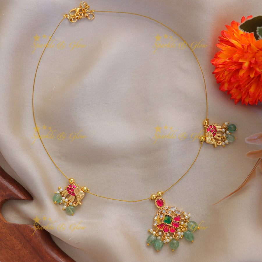 Introducing our latest Invisible Necklaces Collection, an assortment of stunning Indian imitation jewellery designed for the modern, yet traditional woman. This elegant collection features pieces such as the Beautiful half moon design kundan short necklace with pearls with invisible chain, Gracious Half moon Idol Lakshmi floral invisible short necklace with mintgreen beads, and many more. Each necklace in this collection showcases intricate kundan work, lustrous pearls, and vibrant beads, all set on an invisible chain for a seamless look.