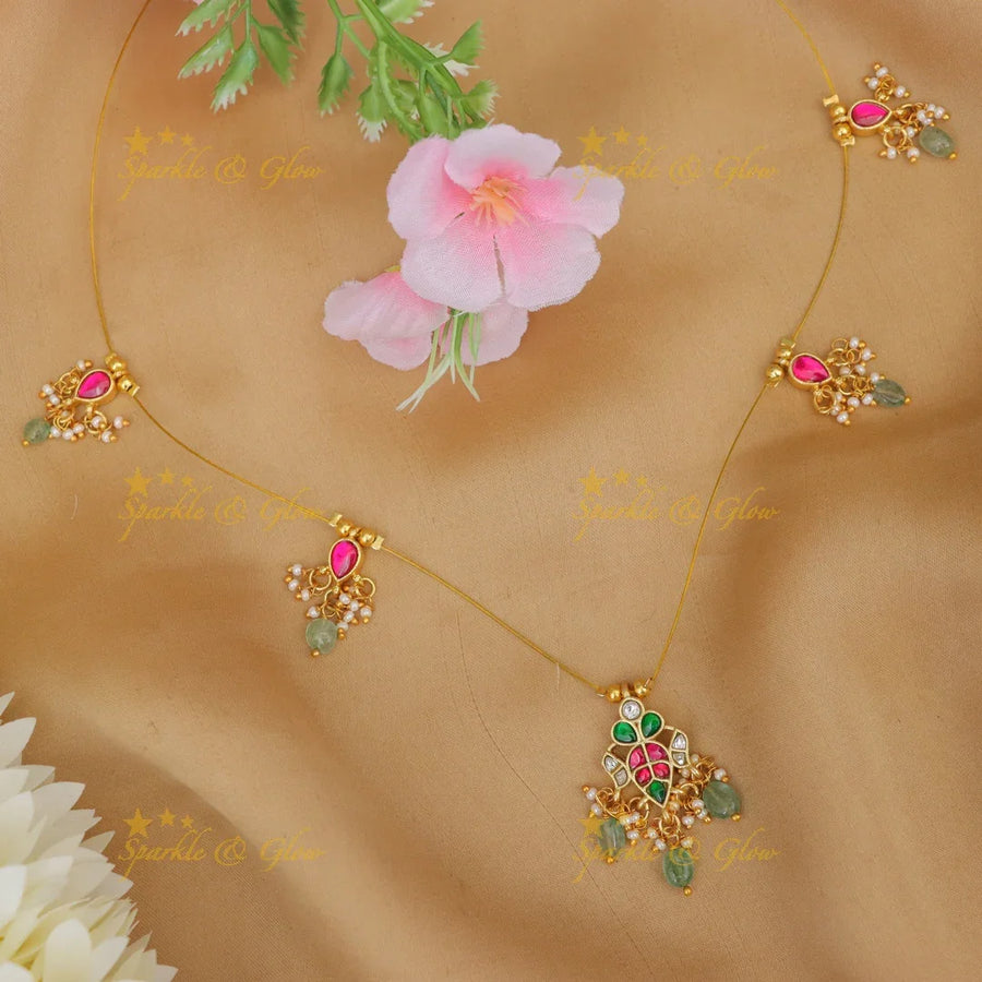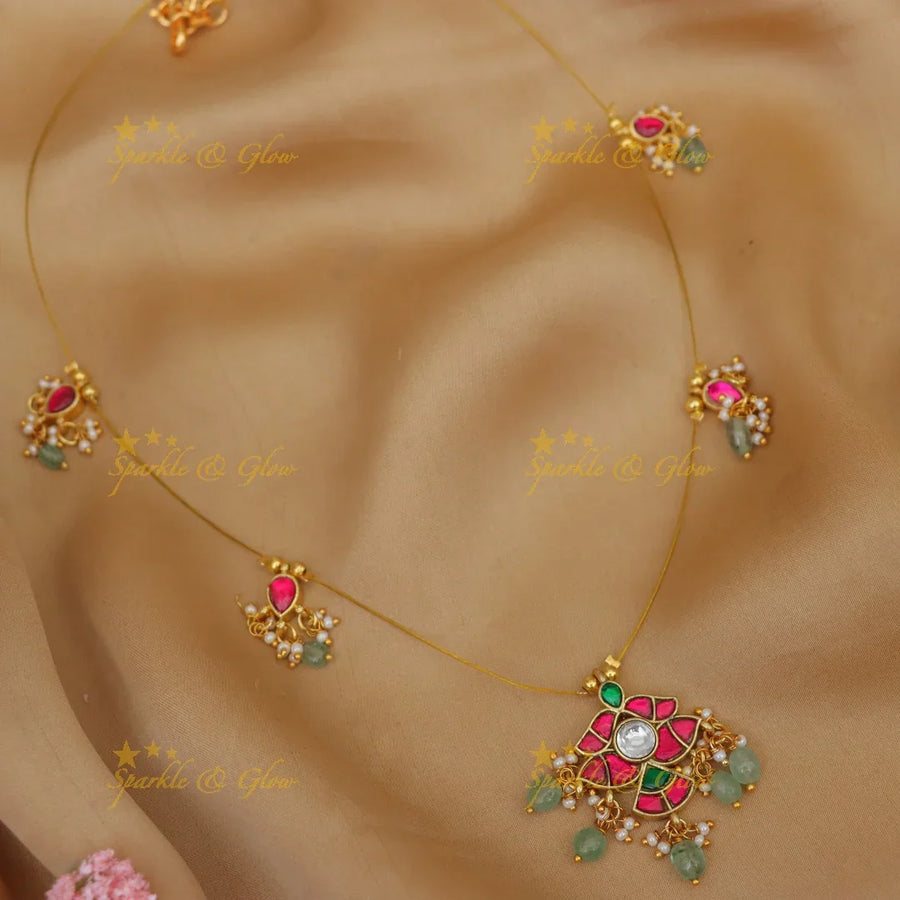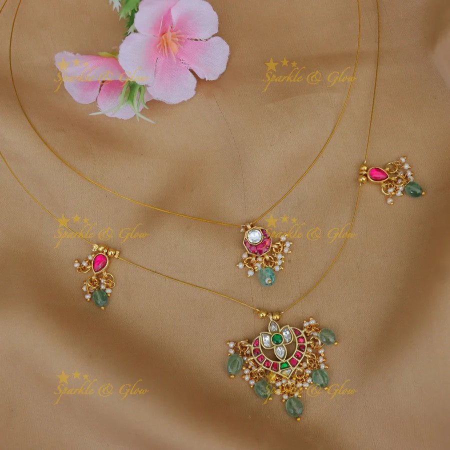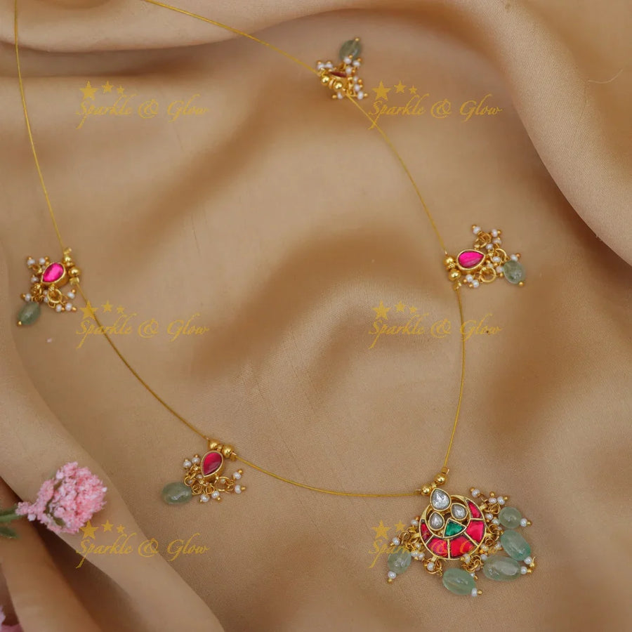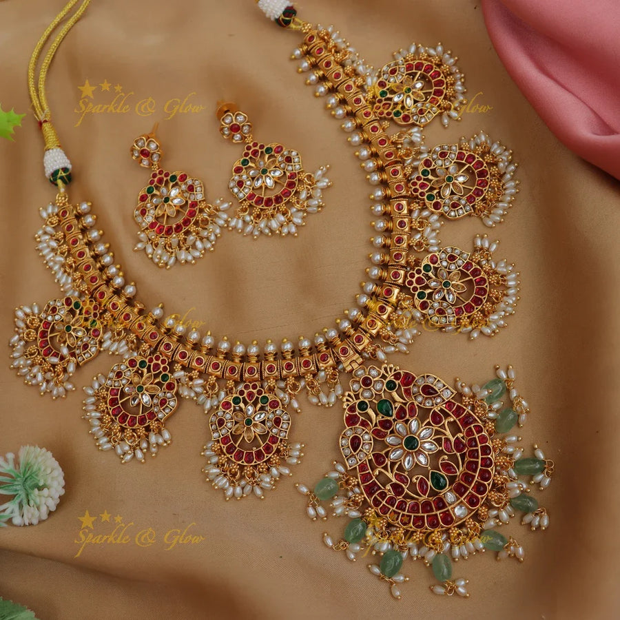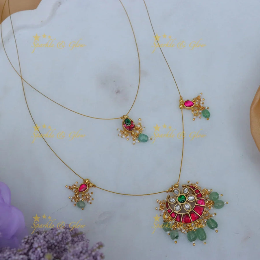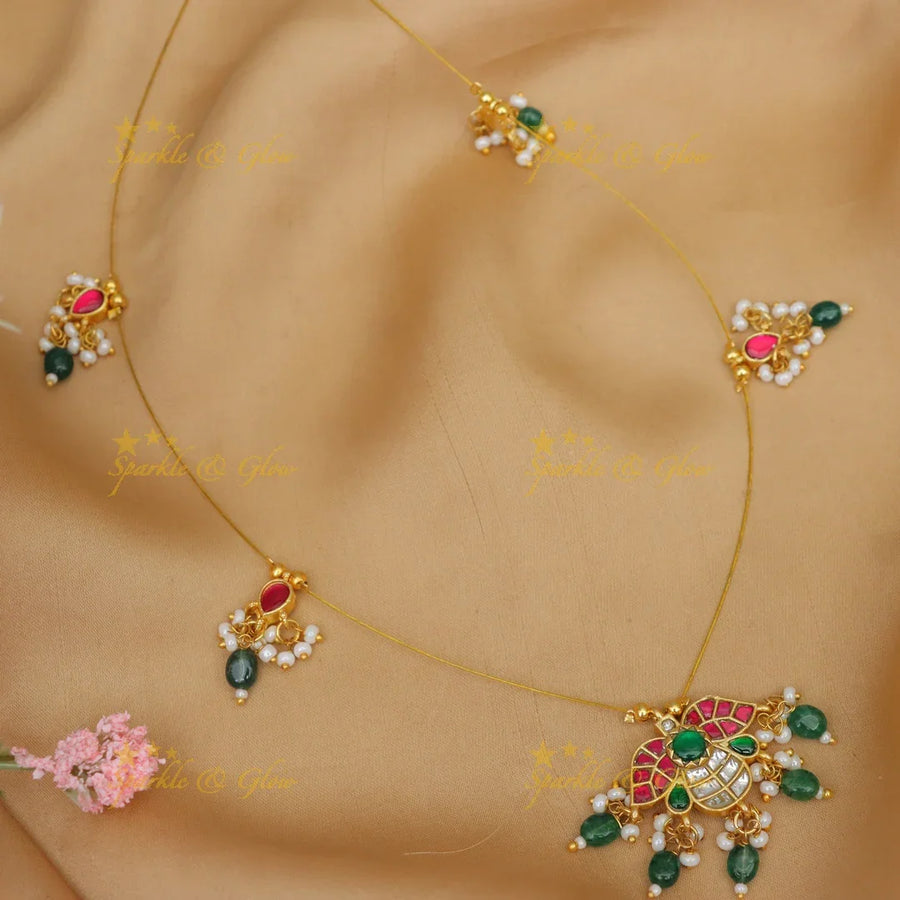 - Perfect for festive occasions and grand celebrations, these pieces make a bold statement with their vibrant colours and matchless designs. The Jadau Kundan Peacock Haram with its rich green beads and the Statement Petal Shape Red and Green Color Jadau Anklet are perfect examples of this.