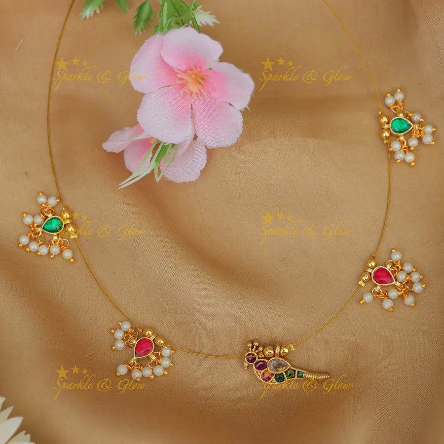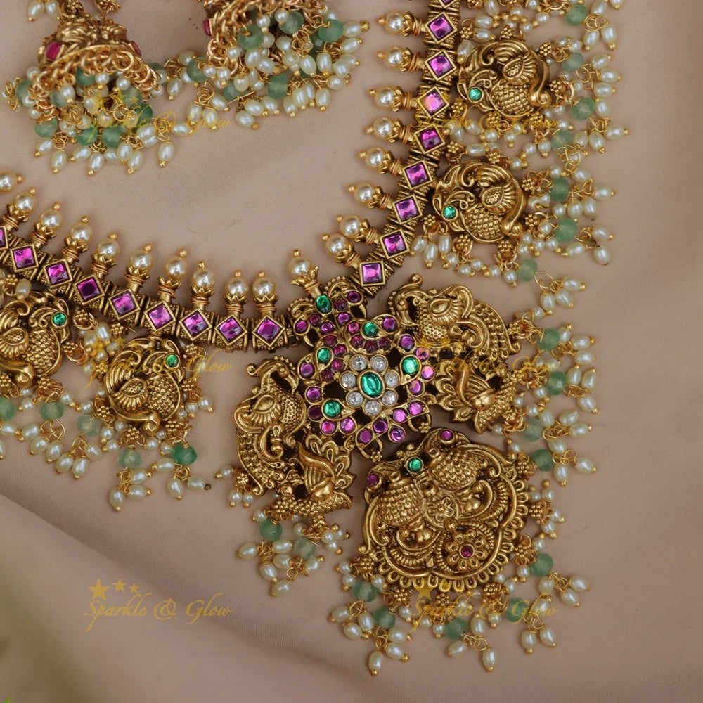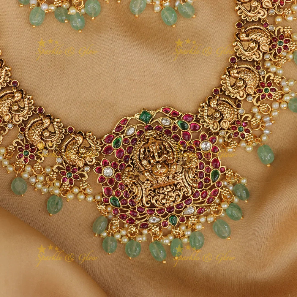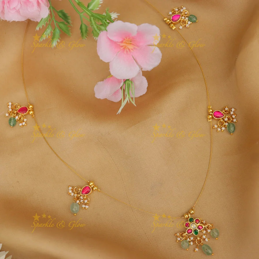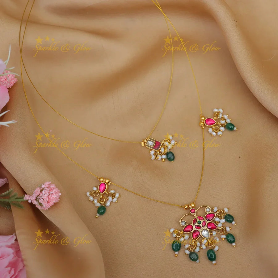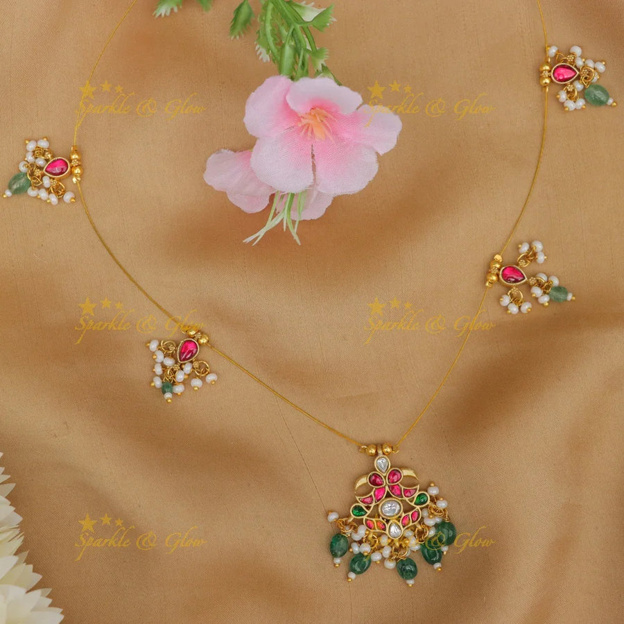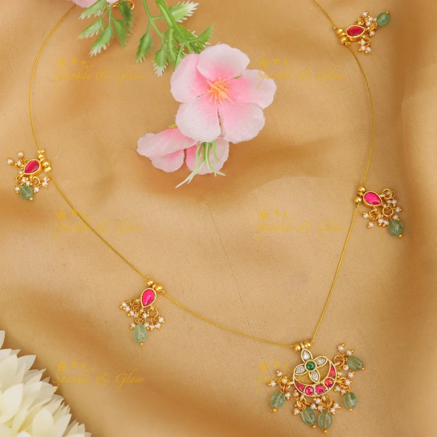 - Perfect for festive occasions and grand celebrations, these pieces make a bold statement with their vibrant colours and matchless designs. The Jadau Kundan Peacock Haram with its rich green beads and the Statement Petal Shape Red and Green Color Jadau Anklet are perfect examples of this.