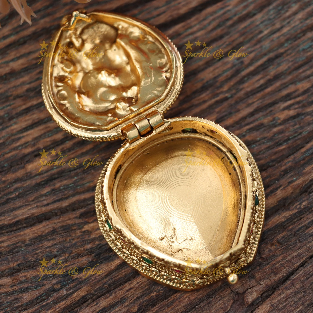 The kumkum box is crafted with premium materials, ensuring durability and elegance. Its stunning gold finish adds a touch of sophistication, making it a perfect addition to your collection of temple jewellery. The intricate detailing of the temple motifs is a testament to the artistry and dedication involved in its creation.