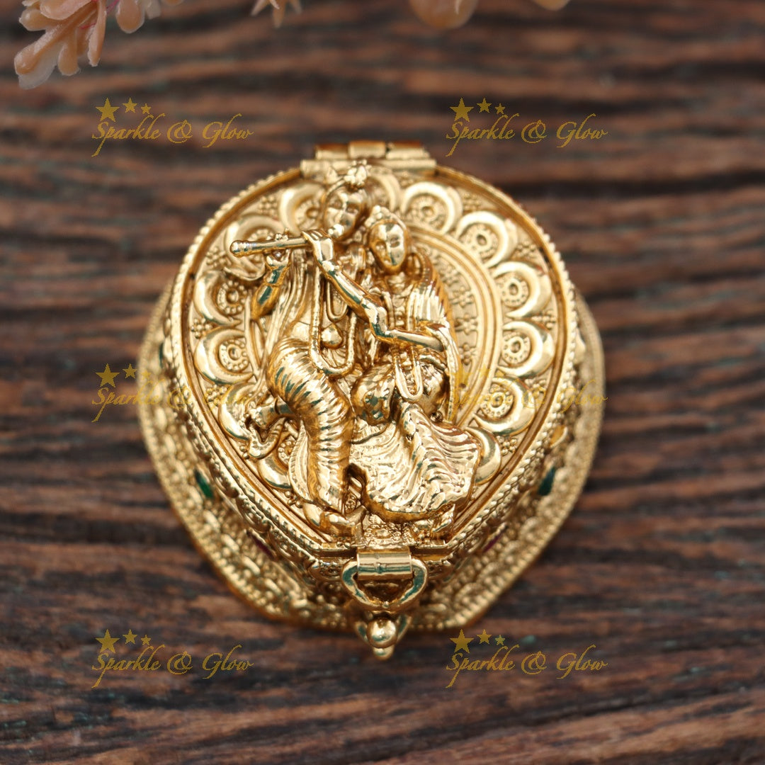 - Design: The kumkum box features a beautiful depiction of divine figures, surrounded by intricate temple motifs that reflect the grandeur of traditional Indian craftsmanship.