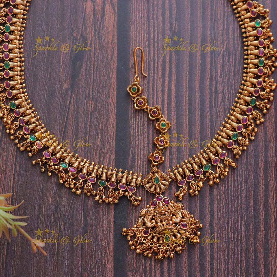 The maang tikka, a quintessential part of traditional temple jewellery, is not just an ornament but a symbol of cultural heritage and artisanal craftsmanship. This stunning piece is adorned with fine embellishments that highlight the beauty and serenity of Goddess Lakshmi, bringing in prosperity and grace to your special day.