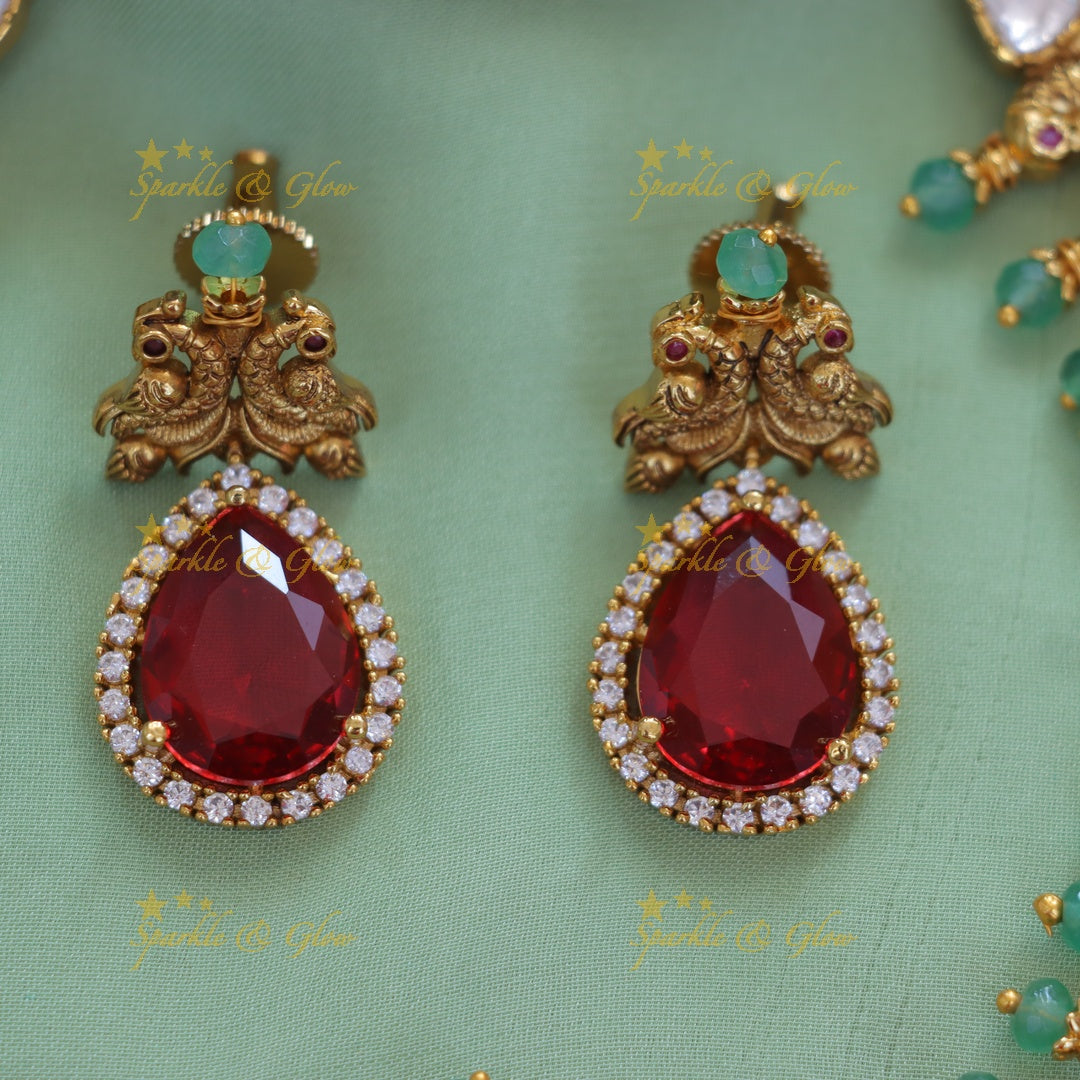 The necklace is adorned with vibrant red and green gemstones, adding a touch of royal elegance. The use of high-quality gold plating ensures durability, while maintaining a sophisticated sheen that enhances its intricate design. Whether you are attending a wedding or celebrating a festive event, this necklace will enhance your outfit with its regal charm.