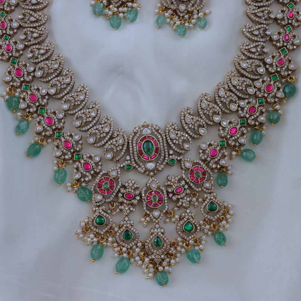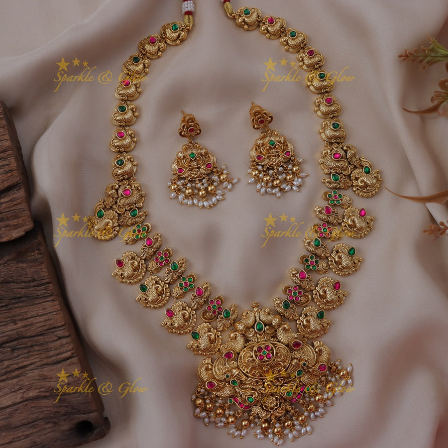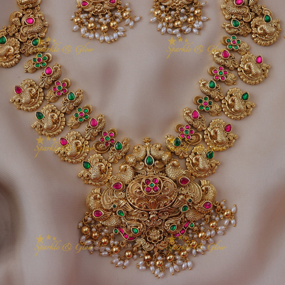 Embrace tradition with our Emerald Peacock Pearl Guttapusalu Haram, a masterpiece of elegance and grace. This exquisite long necklace showcases vibrant emerald hues paired with delicate rice pearls, embodying the grandeur of temple jewellery. The intricate peacock motifs and gold finish add a touch of royal allure, making it a perfect choice for festive occasions and weddings.