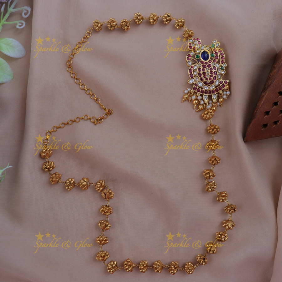 - Design: This gold necklace features a detailed design inspired by traditional Indian motifs, perfectly blending classic elegance with modern style.