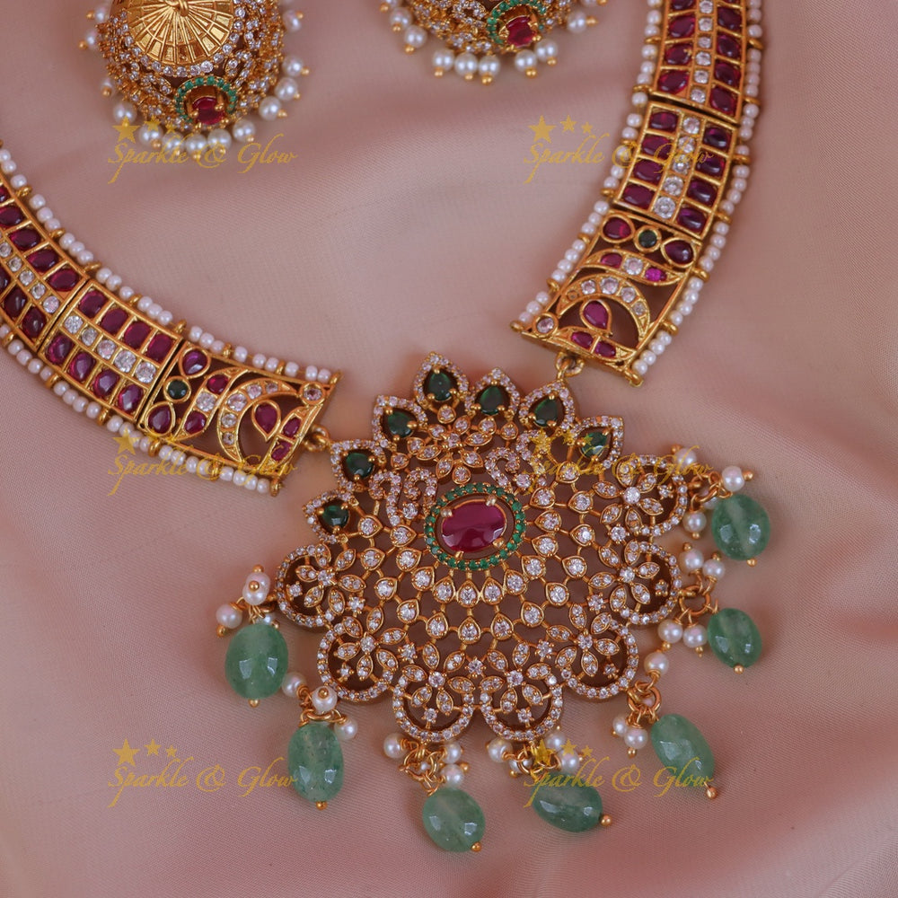 - Design: The necklace boasts an elaborate design of green and gold with studded stones, inspired by the regal charm of traditional Indian jewellery.