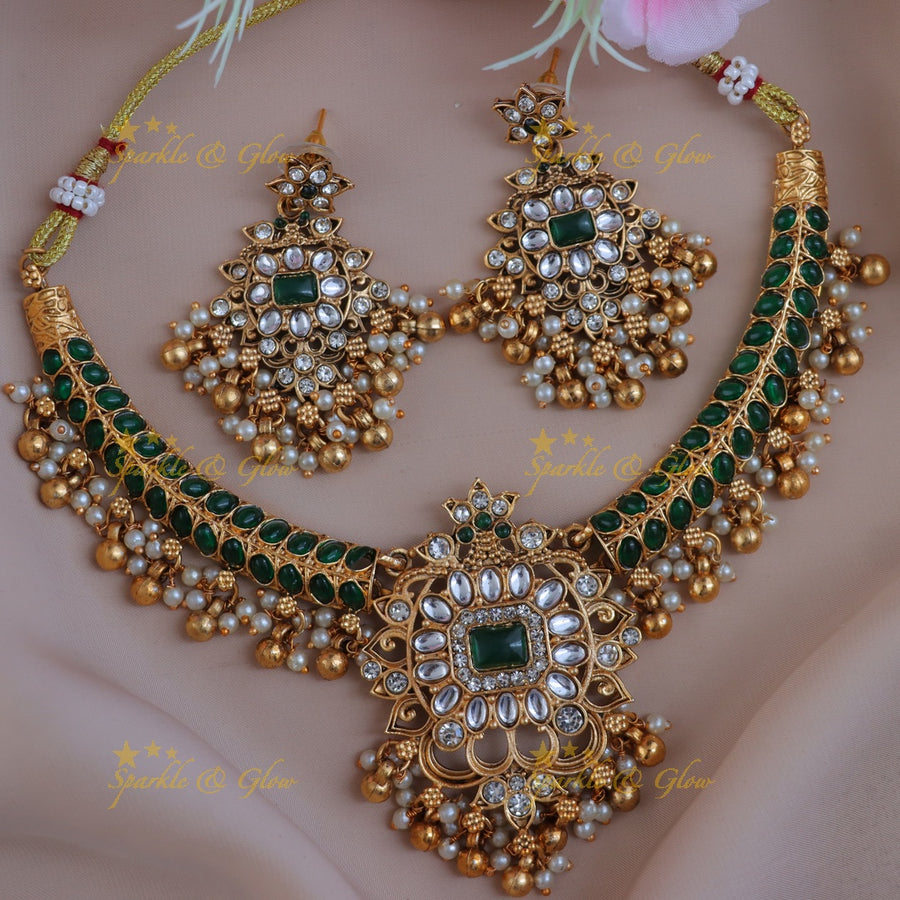 The intricate craftsmanship of this necklace set is a testament to our dedication to preserving the art of Indian jewelry making. Each piece is studded with green gemstones and pearls, set in gold-plated metal to create a luxurious look that's perfect for enhancing your bridal attire or elevating your festive ensemble. The short necklace design makes it versatile for various necklines and occasions.