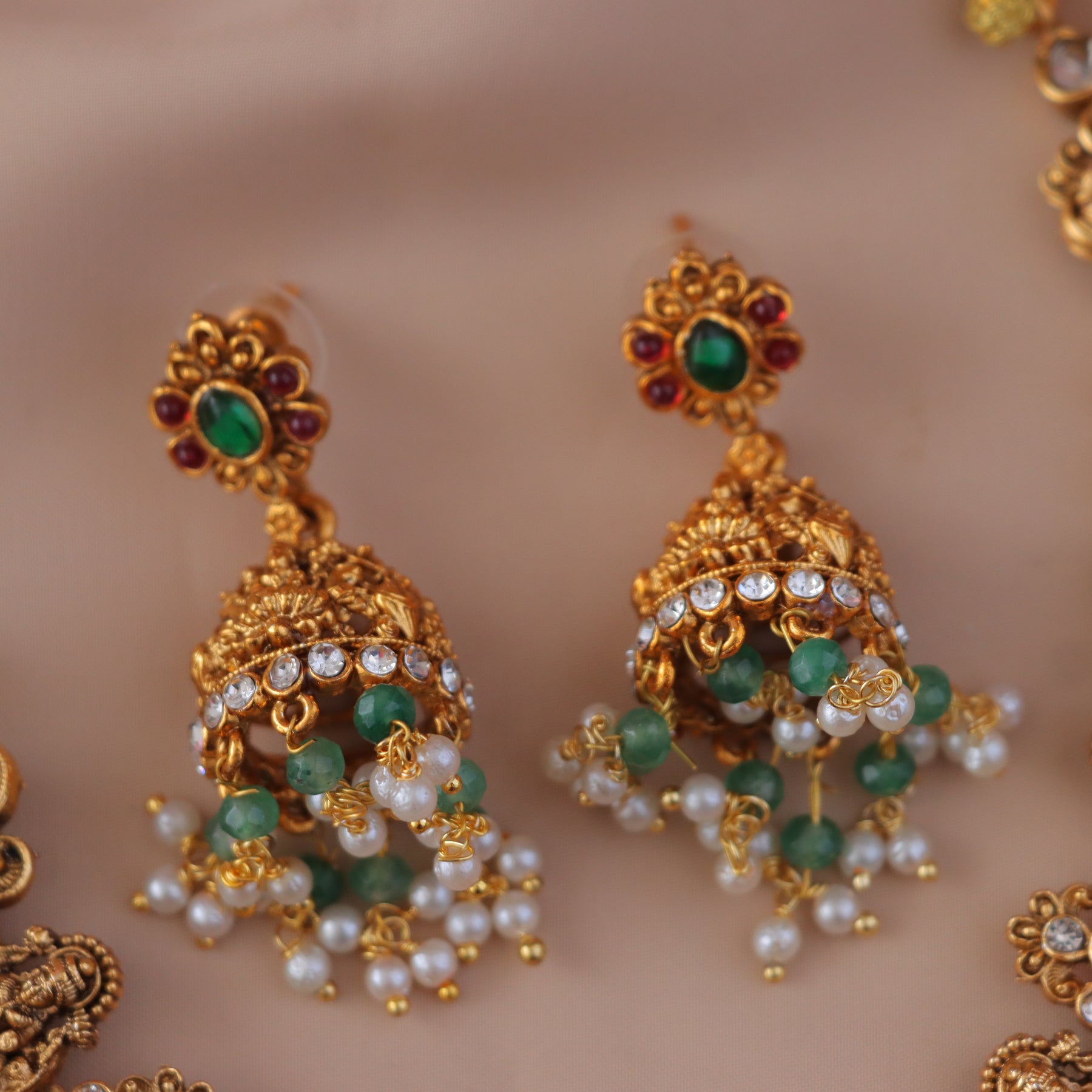 This resplendent necklace is inspired by the rich cultural heritage of India, featuring motifs of mangoes and peacocks that symbolize prosperity and grace. The temple-style design, adorned with intricately carved idols and gemstones, adds a divine touch to your ensemble.