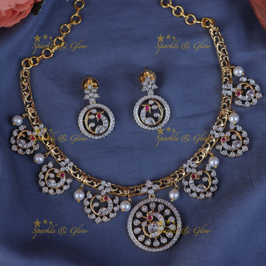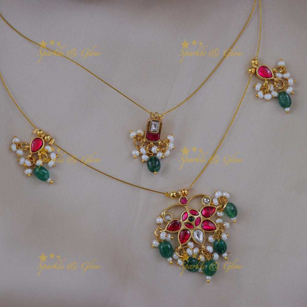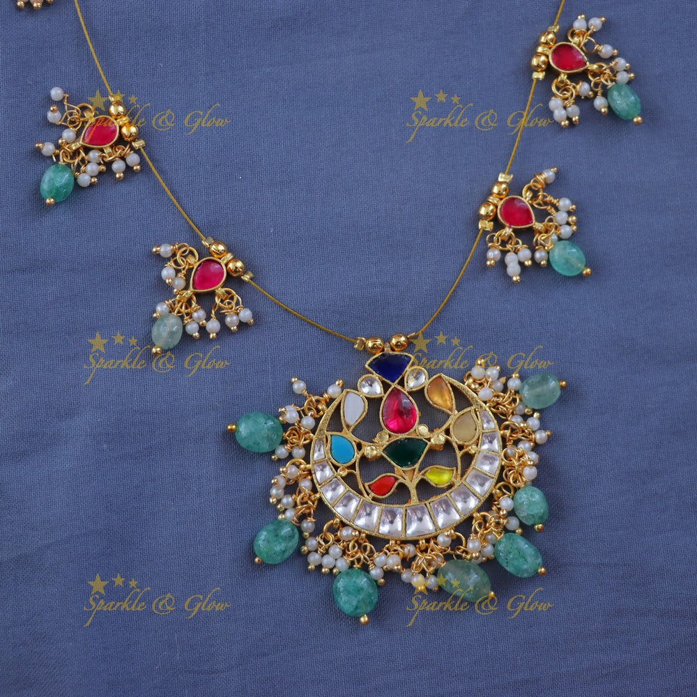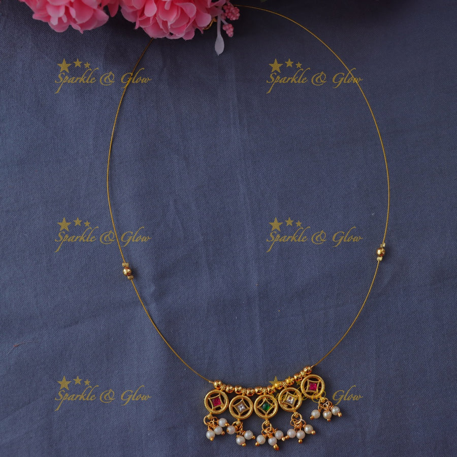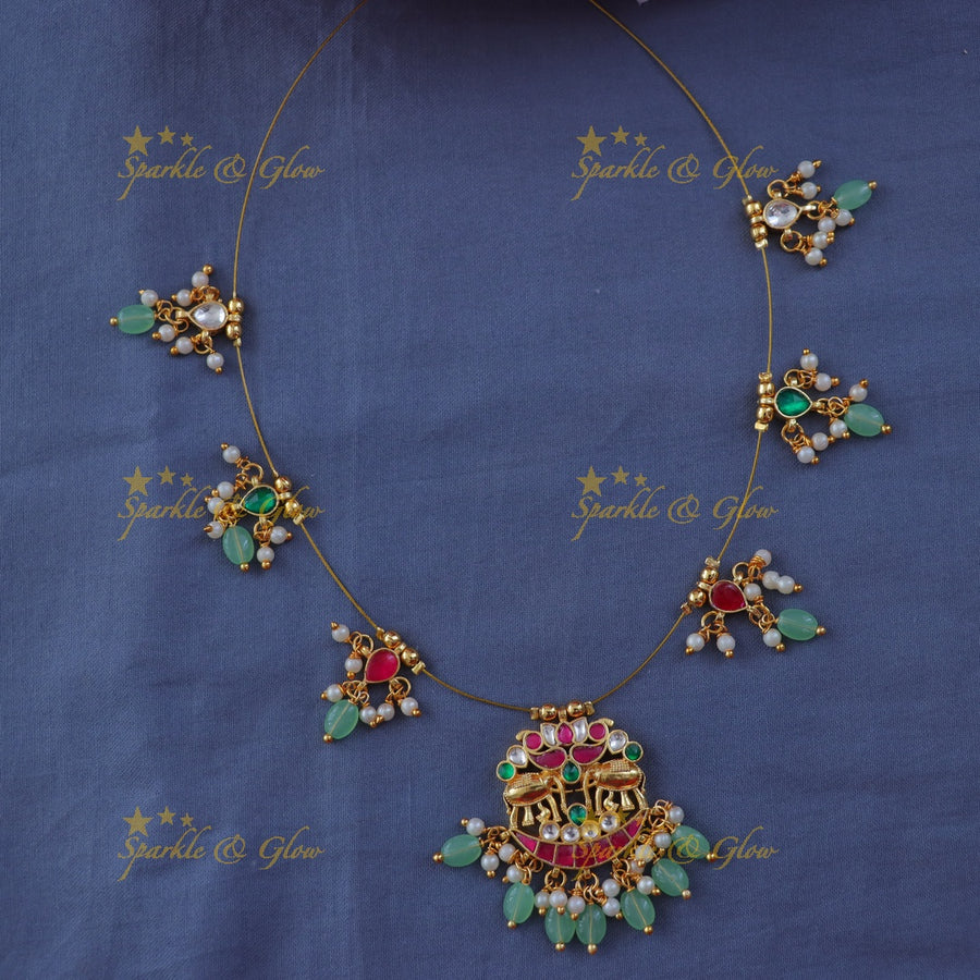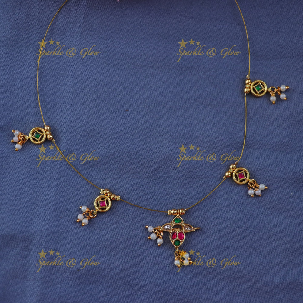 Our offerings also include the unique half moon shaped ruby like semi precious stones gutta pusalu and the statement Cz stone choker with pastel green beads in pink. The Navarathna AD Gutta pusalu choker, the beautiful gutta pusalu necklace with kemp and cz stones, and the pearl high neck choker in kemp green are the other notable pieces in our collection.