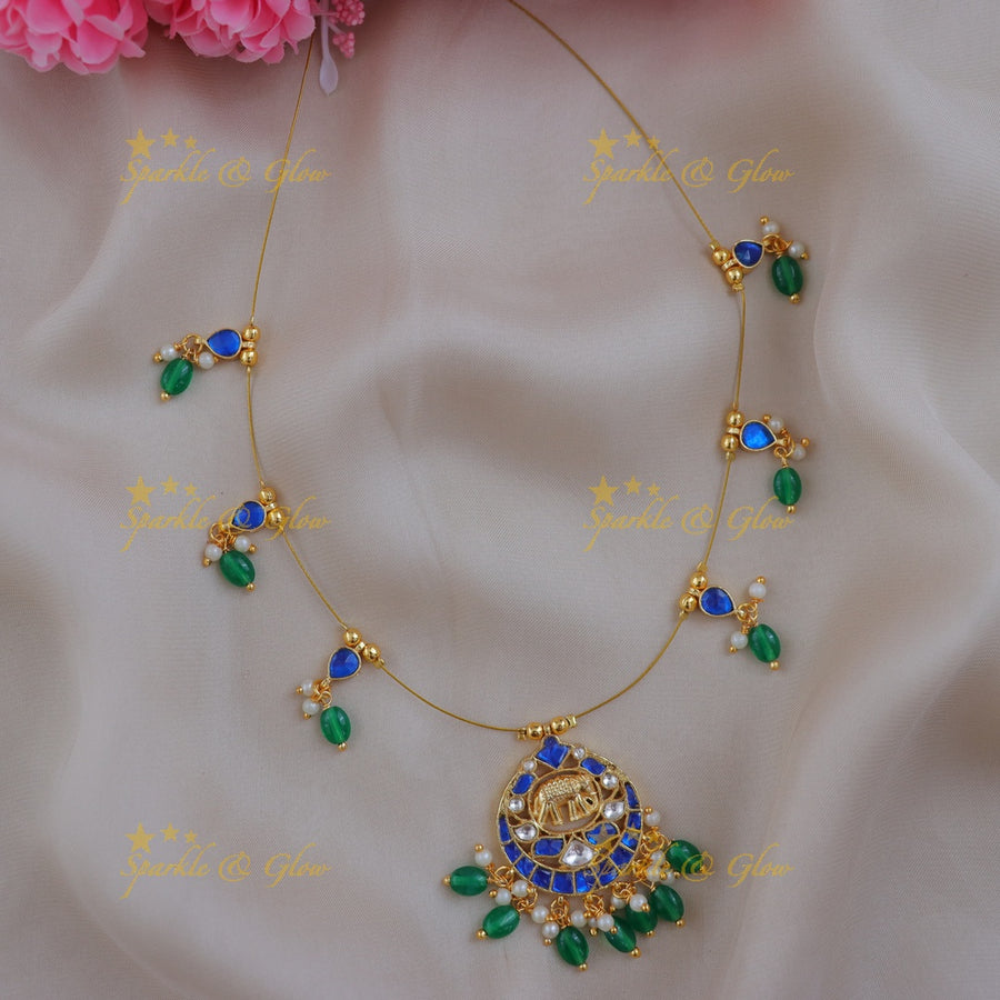 Our premium Indian imitation jewellery brand takes immense pride in presenting the exquisite Necklace Collection. Each piece is meticulously designed, giving utmost attention to intricate details. Our necklace collection boasts some of the most stunning pieces like the beautiful gutta pusalu haram adorned with kemp and cz stones, the real kemp stones gold alike gutta pusalu high neck choker with green beads, and the matte gold polished gutta pusalu haram available in multiple colors.