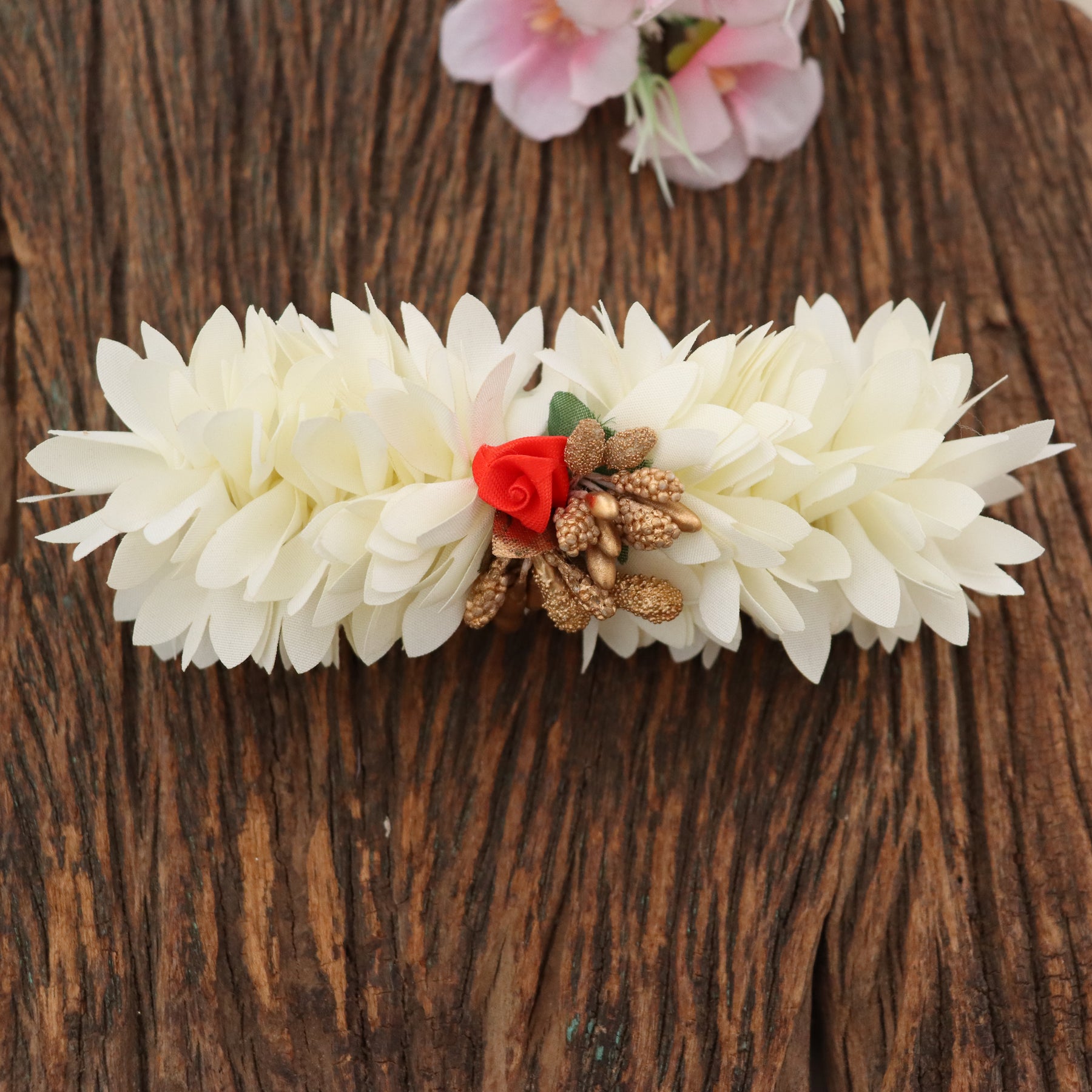 Enhance your festive look with our exquisite Floral Ribbon Hair Clip with Rose & Glitter, Large. This beautifully crafted accessory features delicate floral motifs in soft ivory, accented by a shimmering gold finish. The elegant rose detail combined with subtle glitter adds a touch of glamour, making it perfect for weddings and special occasions.