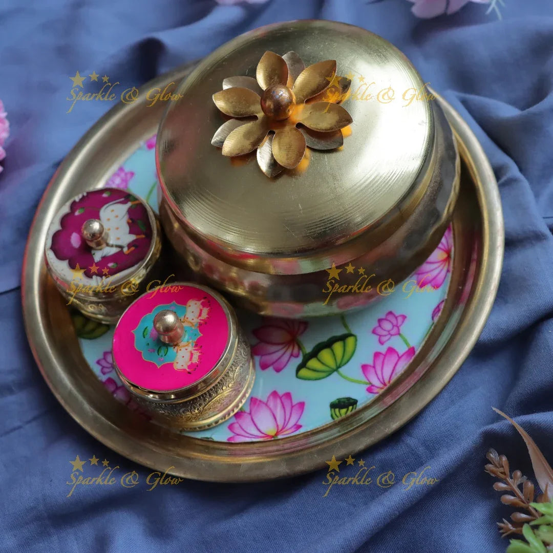 Elegant Kumkum Box & Gold Tray Set for Festive Gifts