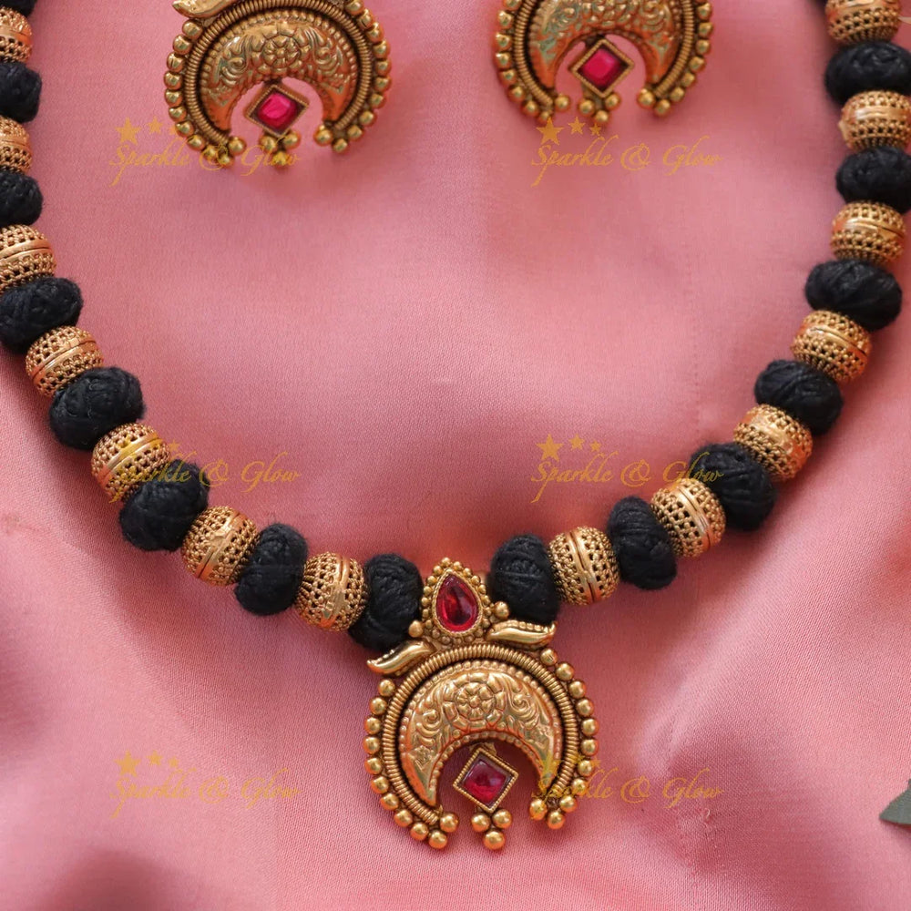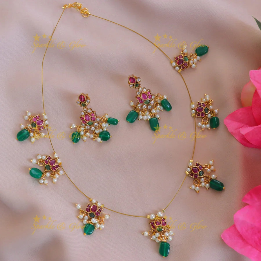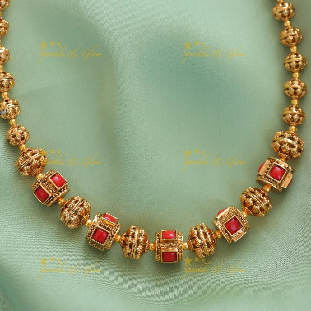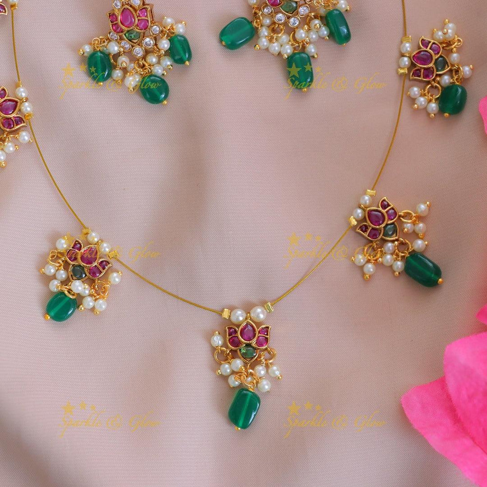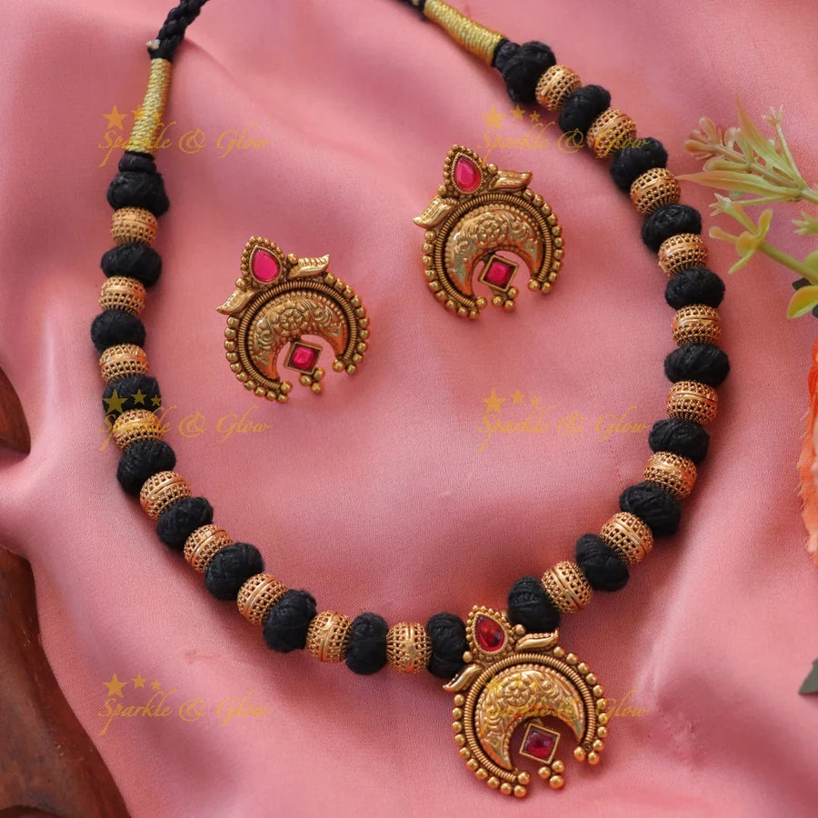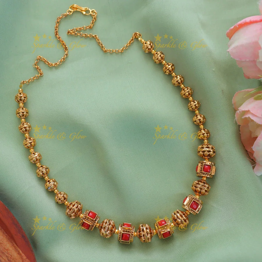 Discover a stunning range of short necklaces, each one a masterpiece meticulously crafted to perfection. Our short necklace collection boasts of pieces adorned with semi-precious stones, CZ stones, kemp stones and many more, all intricately incorporated into various designs such as the half-moon shaped ruby-like gutta pusalu necklace, the gold alike peacock carved Lakshmi short necklace, and the gold alike Dashavatharam gutta pusalu necklace. The perfect blend of traditional and contemporary styles, these necklaces are a testament to the exquisite craftsmanship and attention to detail that sets our jewellery apart.