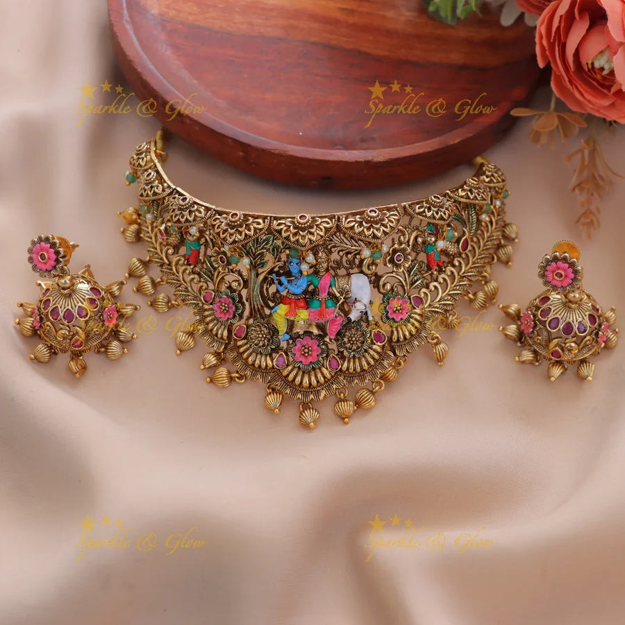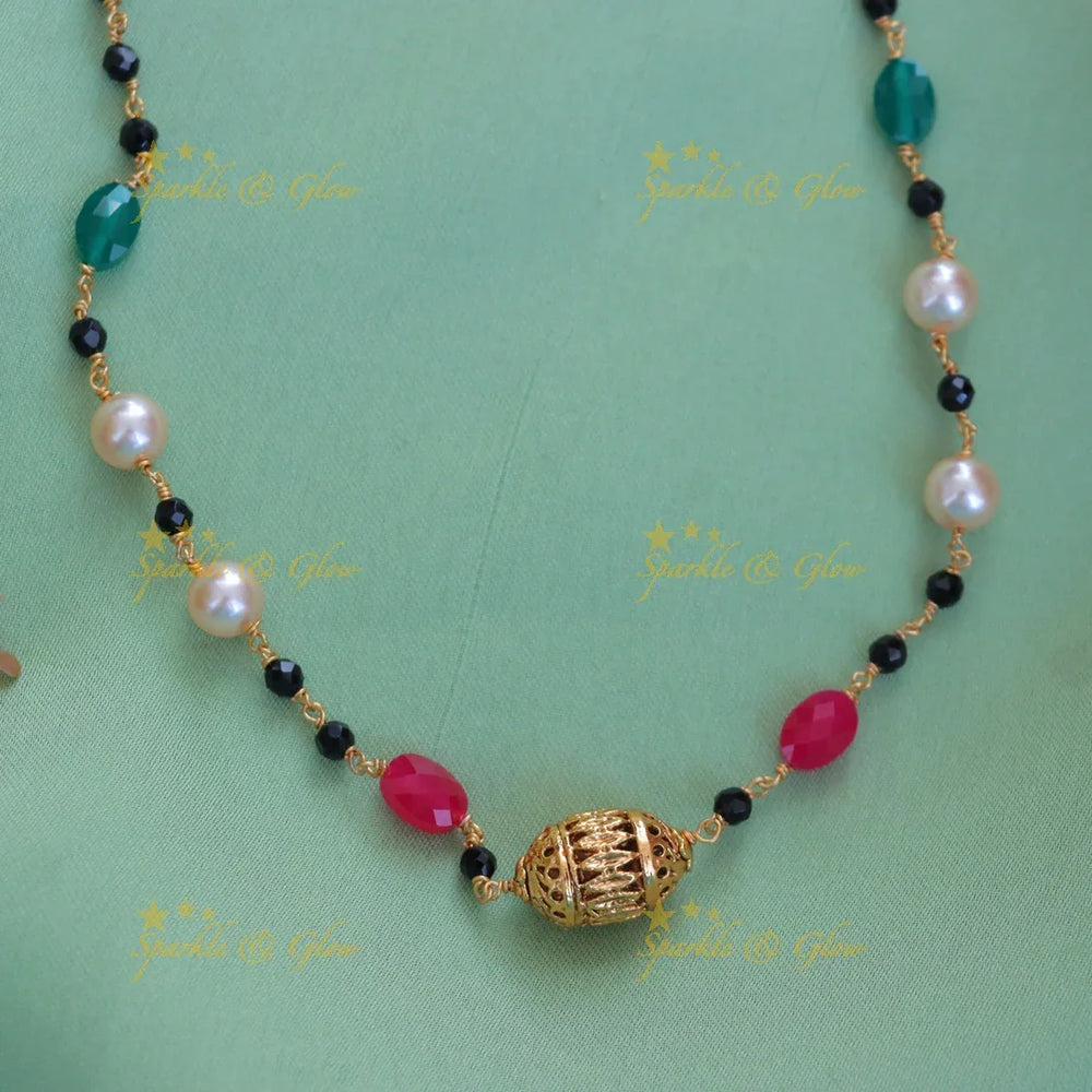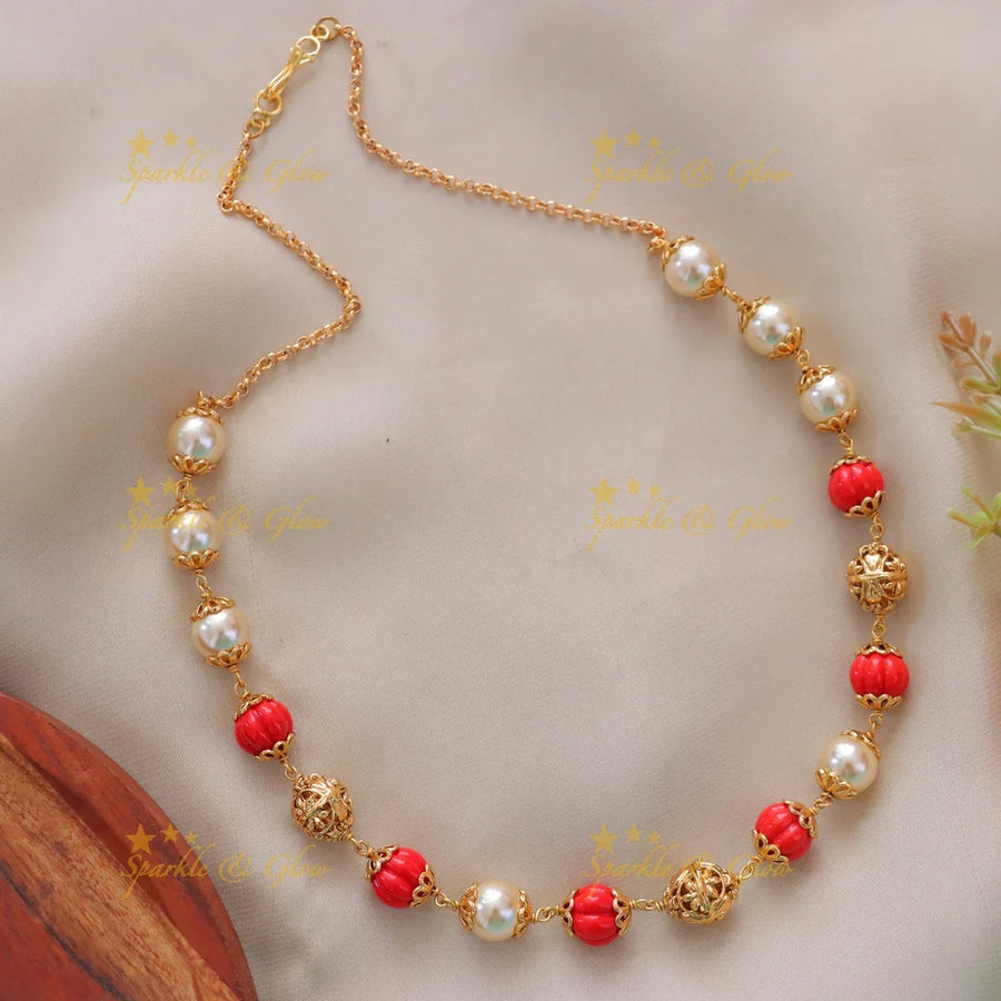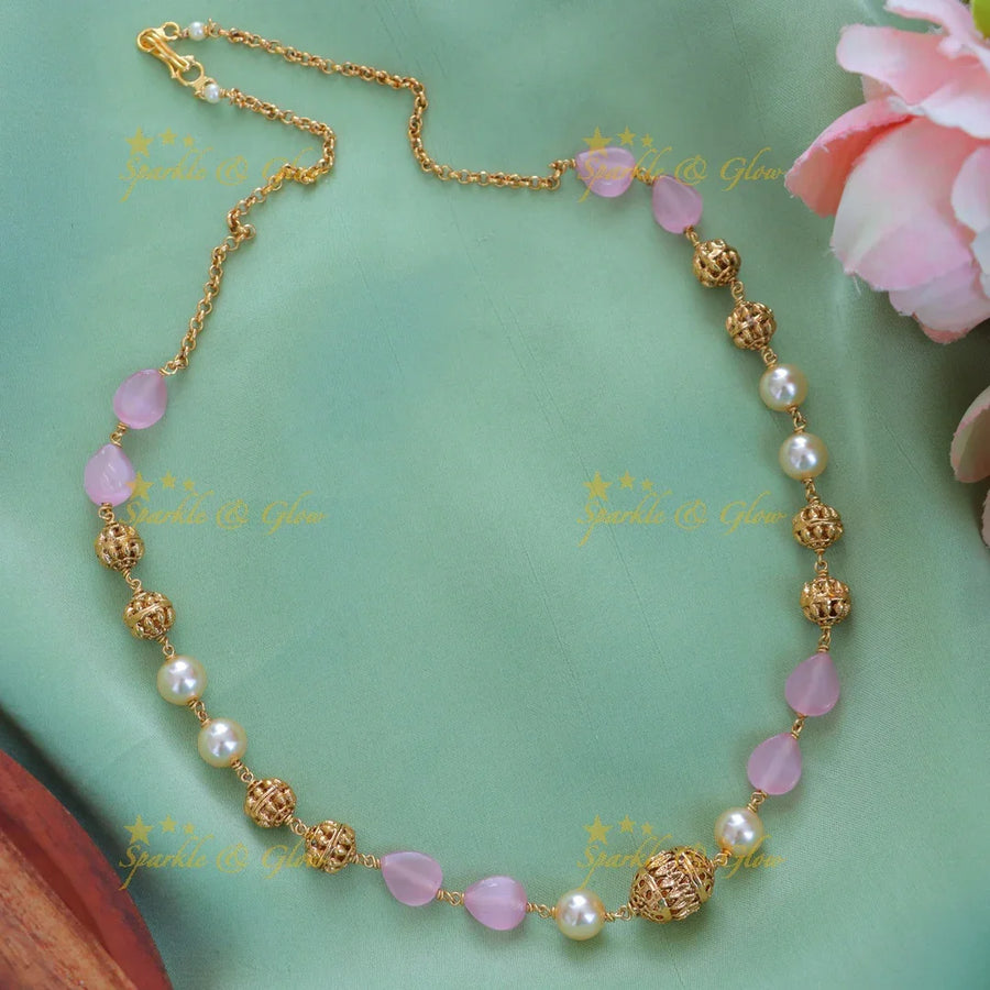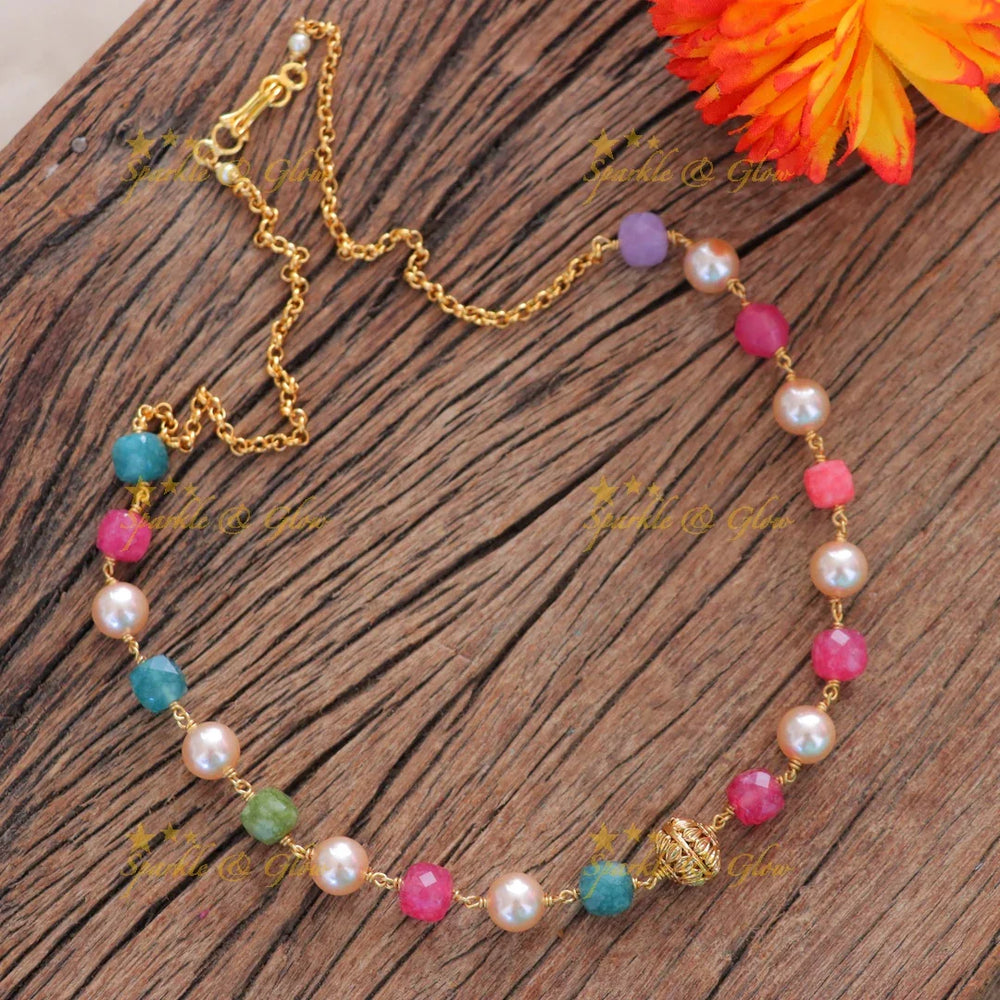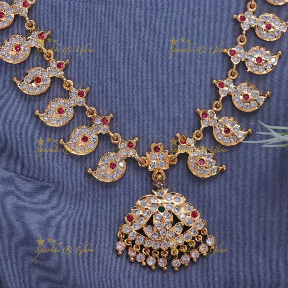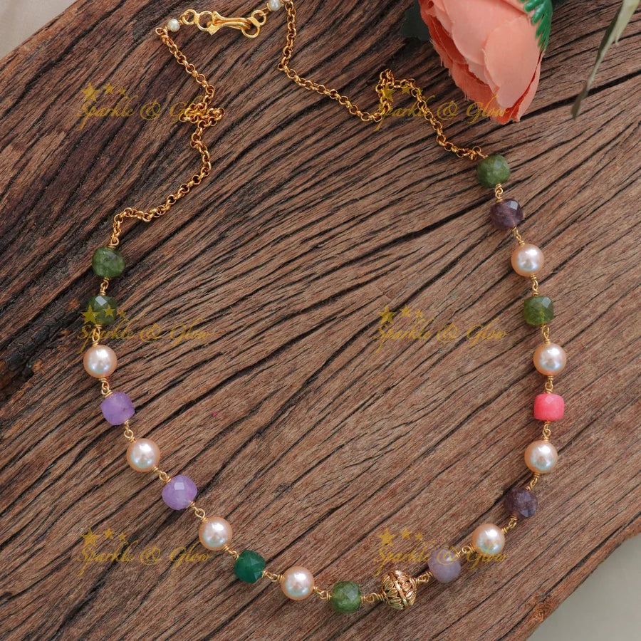Discover a stunning range of short necklaces, each one a masterpiece meticulously crafted to perfection. Our short necklace collection boasts of pieces adorned with semi-precious stones, CZ stones, kemp stones and many more, all intricately incorporated into various designs such as the half-moon shaped ruby-like gutta pusalu necklace, the gold alike peacock carved Lakshmi short necklace, and the gold alike Dashavatharam gutta pusalu necklace. The perfect blend of traditional and contemporary styles, these necklaces are a testament to the exquisite craftsmanship and attention to detail that sets our jewellery apart.