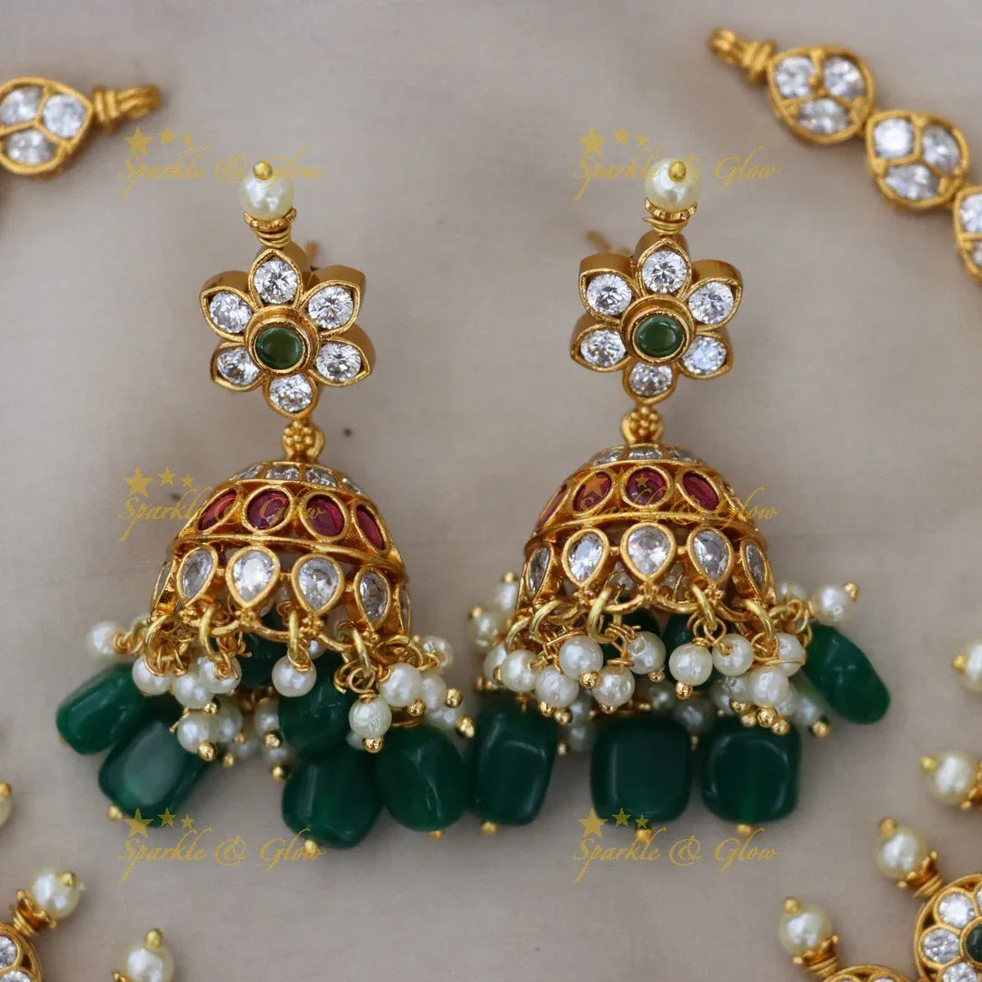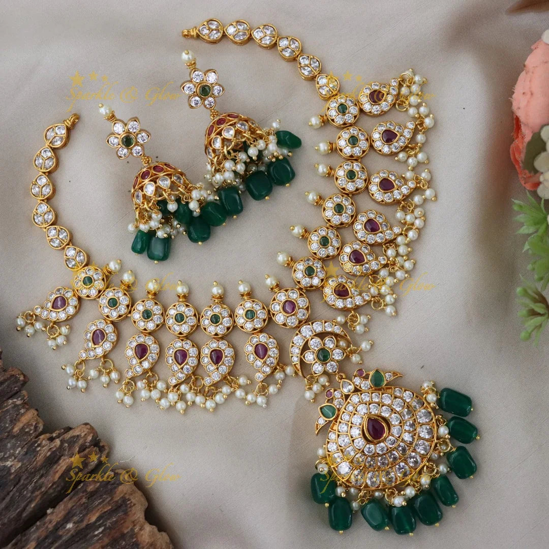 This stunning necklace is adorned with sparkling stones, set in a lustrous gold finish that mimics the elegance of real jewellery. The Gutta Pusalu style further enhances its beauty, offering an opulent look for weddings and festive occasions.