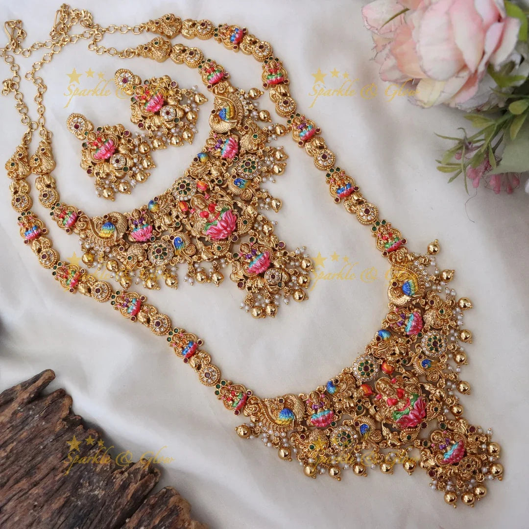 - Inspired Design: The jewellery is inspired by temple art, featuring the majestic peacock and the revered figure of Lakshmi, the goddess of wealth.