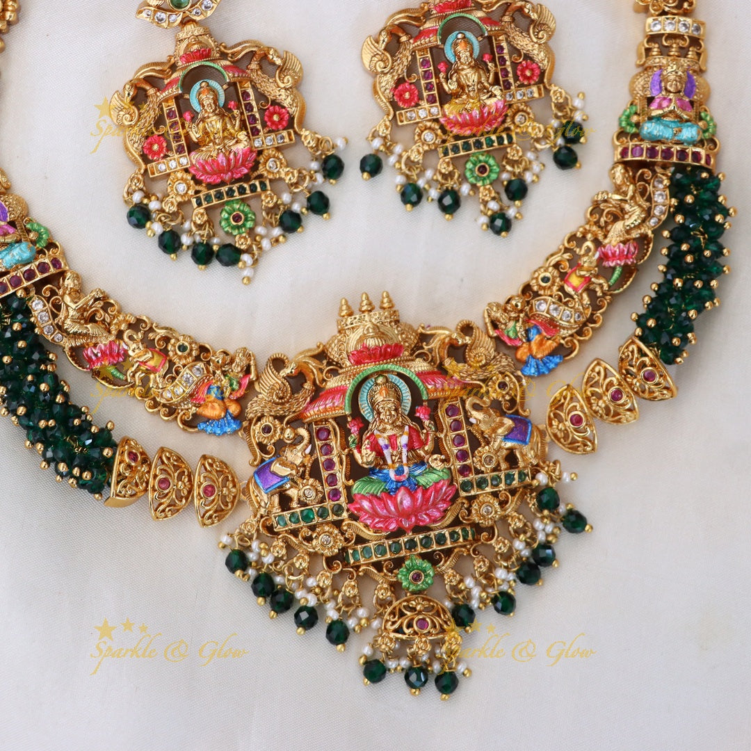 The necklace features detailed motifs of deities, adorned with vibrant stones, which evoke a sense of spiritual serenity and royal beauty. The accompanying earrings are equally majestic, offering a harmonious complement to the necklace.