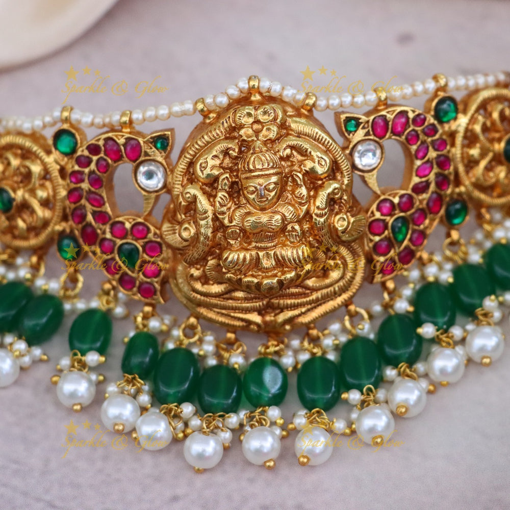 The centerpiece of this necklace is the ornate mango motif, a symbol of love and prosperity in Indian tradition. Its vibrant hues and gold plating capture the aesthetic beauty synonymous with Indian heritage. Accentuated with pearls and colored stones, the necklace gracefully contours your neckline, adding a touch of royalty to your ensemble.