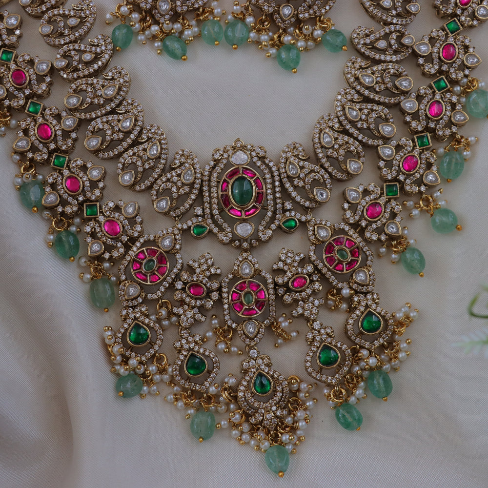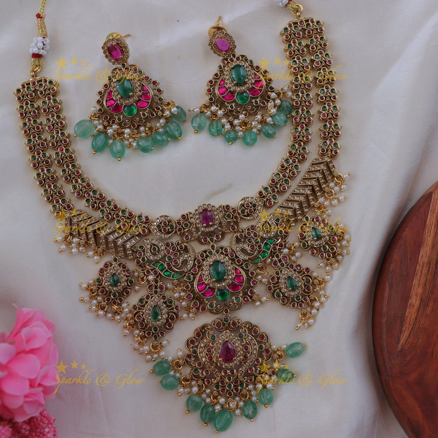 Introducing the exquisite Lakshmi Necklace with Ruby, Emerald & Pearls, a masterpiece of traditional Indian craftsmanship. This elegant short necklace is adorned with intricate peacock carvings and divine motifs of Goddess Lakshmi, symbolizing prosperity and grace. The vivid colors of ruby and emerald CZ stones add a vibrant touch, while the delicate pearls and gold beads offer a timeless finish.