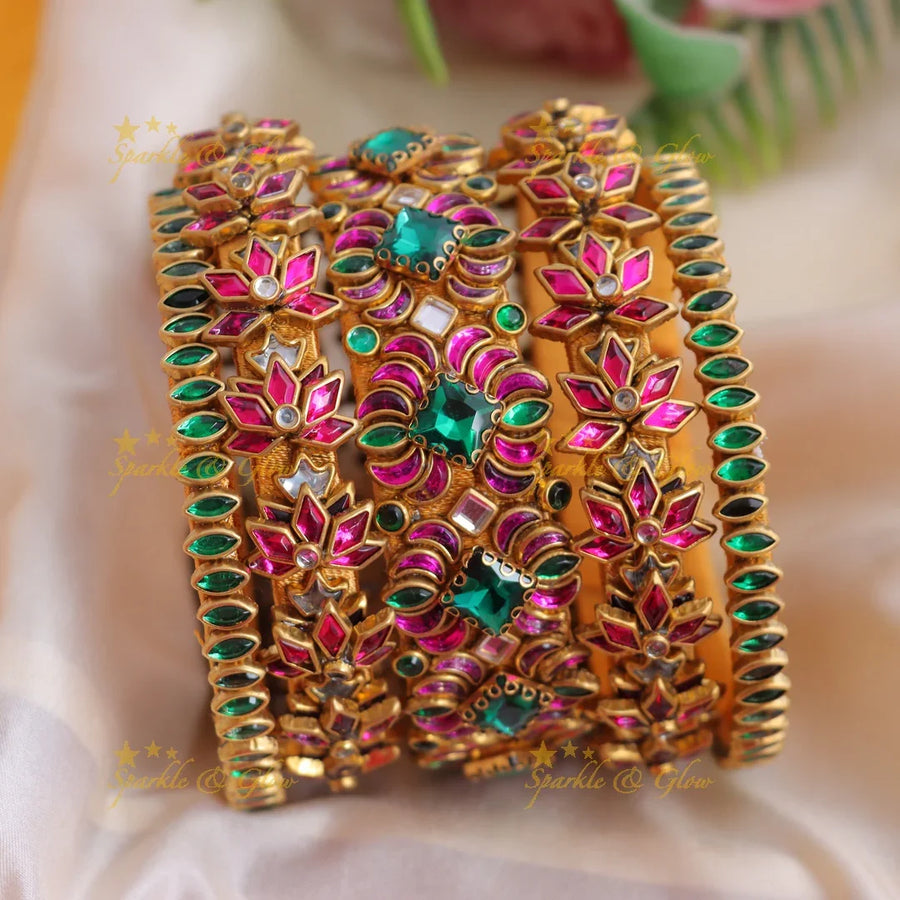 Kundan Floral Silk Thread Bangles - Green & Pink, One hand