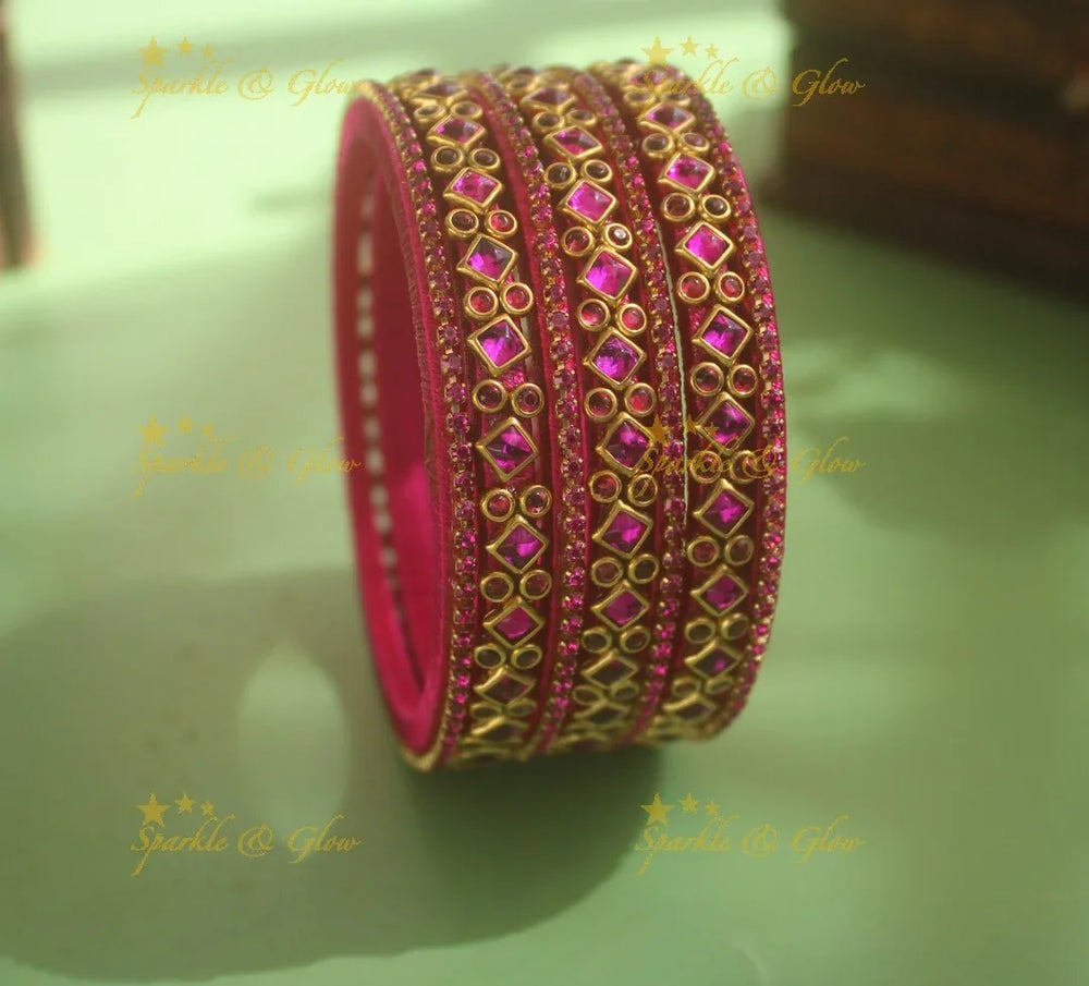 The bangles feature gold-toned embellishments that beautifully contrast with the silk's sheen, making them a perfect accessory for any traditional or contemporary outfit. Ideal for making a statement during celebrations, these bangles blend tradition with modernity, ensuring you stand out in any gathering.