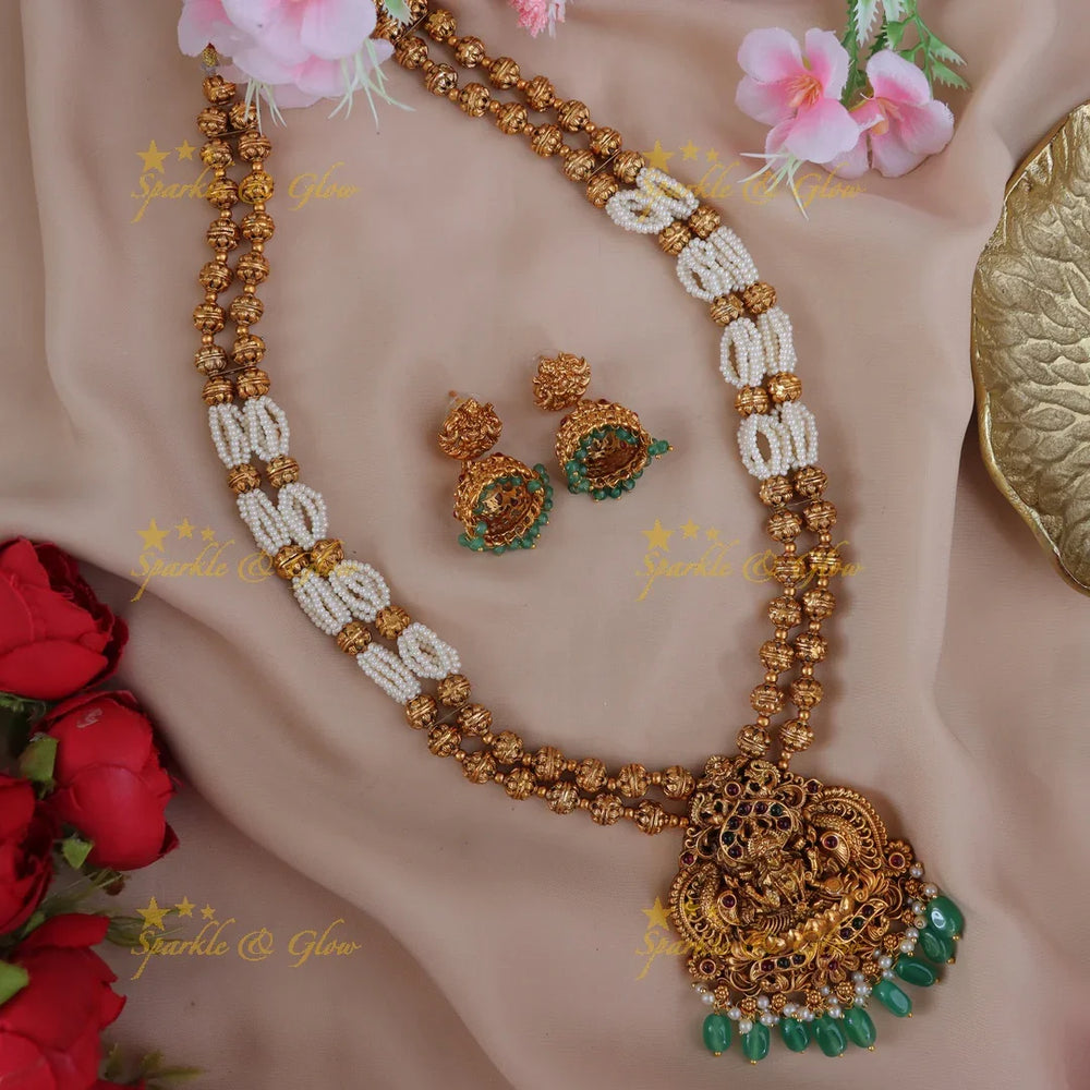 Grand Gold alike Lakshmi carved bridal necklace with emerald and gold beads - Sparkle and Glow