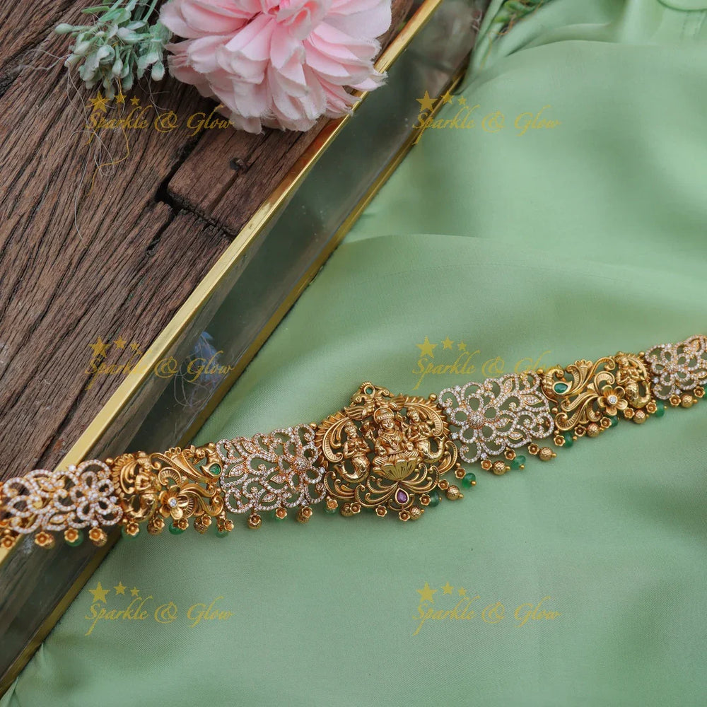 Invoke the grace of divinity and tradition with our Antique Gold alike Goddess Lakshmi Hip Chain, exquisitely crafted for the modern bride who cherishes timeless elegance. This temple-inspired hip chain (oddiyanam or vaddanam) celebrates divine heritage with its magnificent Goddess Lakshmi motif, surrounded by intricate detailing and a dazzling symphony of pearls and American Diamond (AD) stones. A perfect blend of spiritual symbolism and festive glamour, this piece elevates bridal and ethnic looks effortlessly.