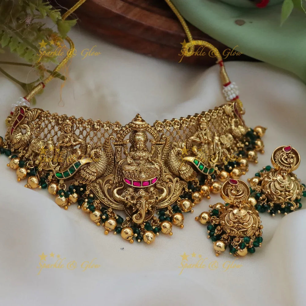 Grand Lakshmi Peacock Elephant carved Bridal Choker with beads