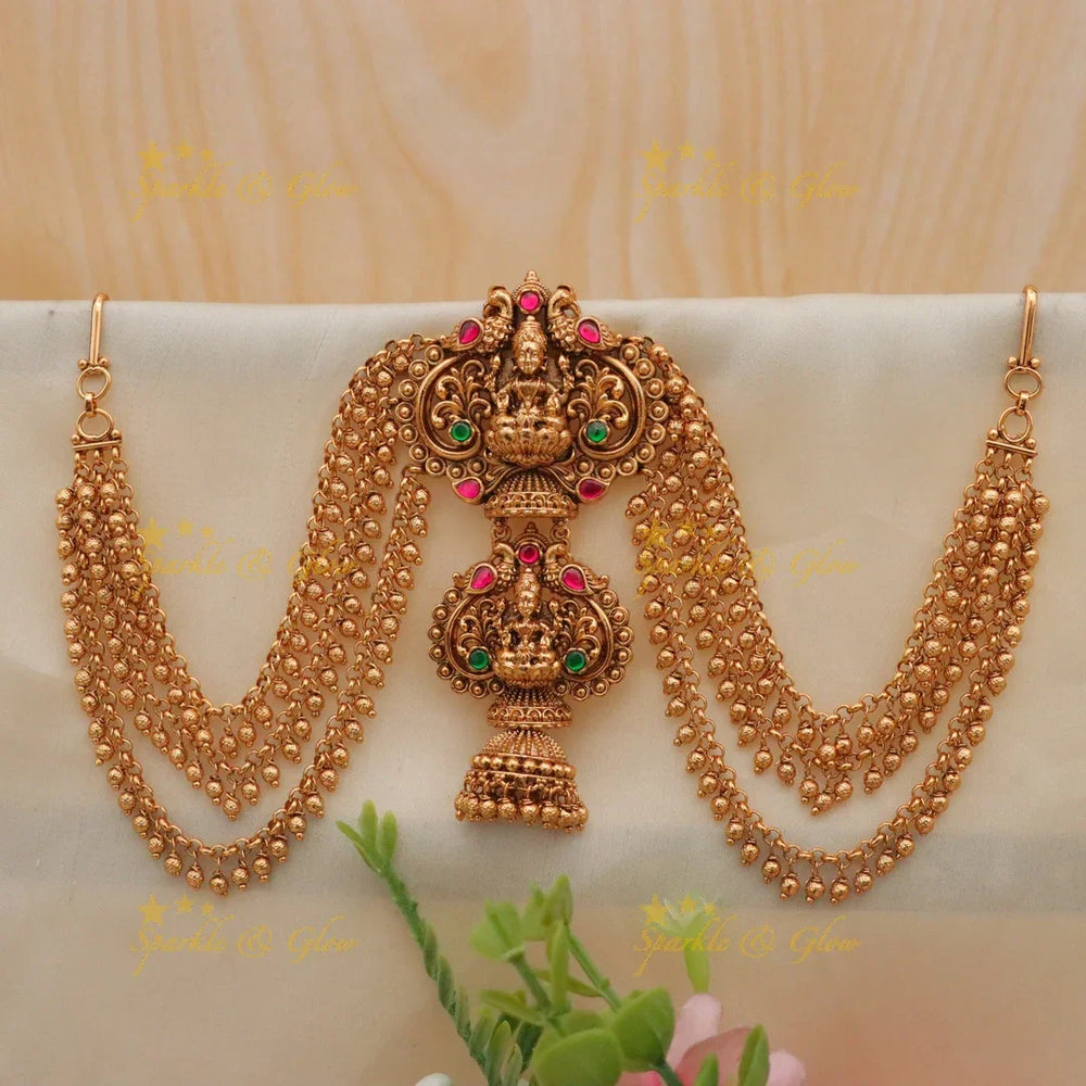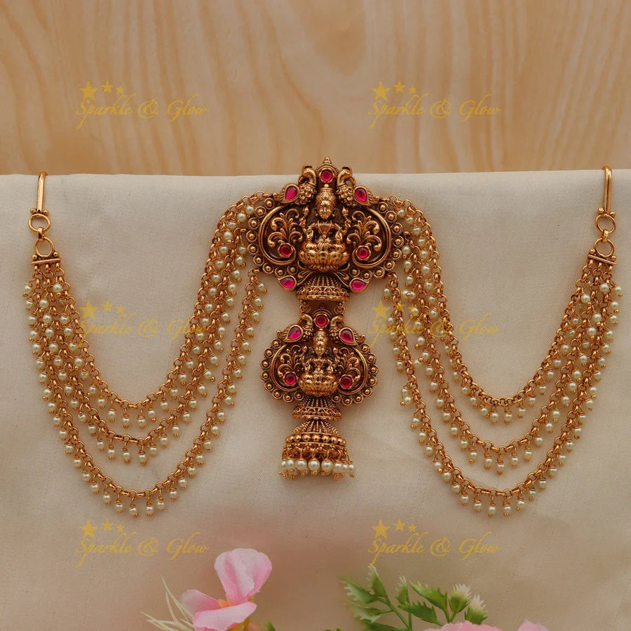 Crafted with intricate peacock motifs, the jadabilla embodies grace and splendor. The detailed craftsmanship features a beautiful cascade of golden chains adorned with shimmering pearls, symbolizing beauty and prosperity. The gold finish enhances the intricate temple design, making it a perfect choice for weddings and festive occasions.