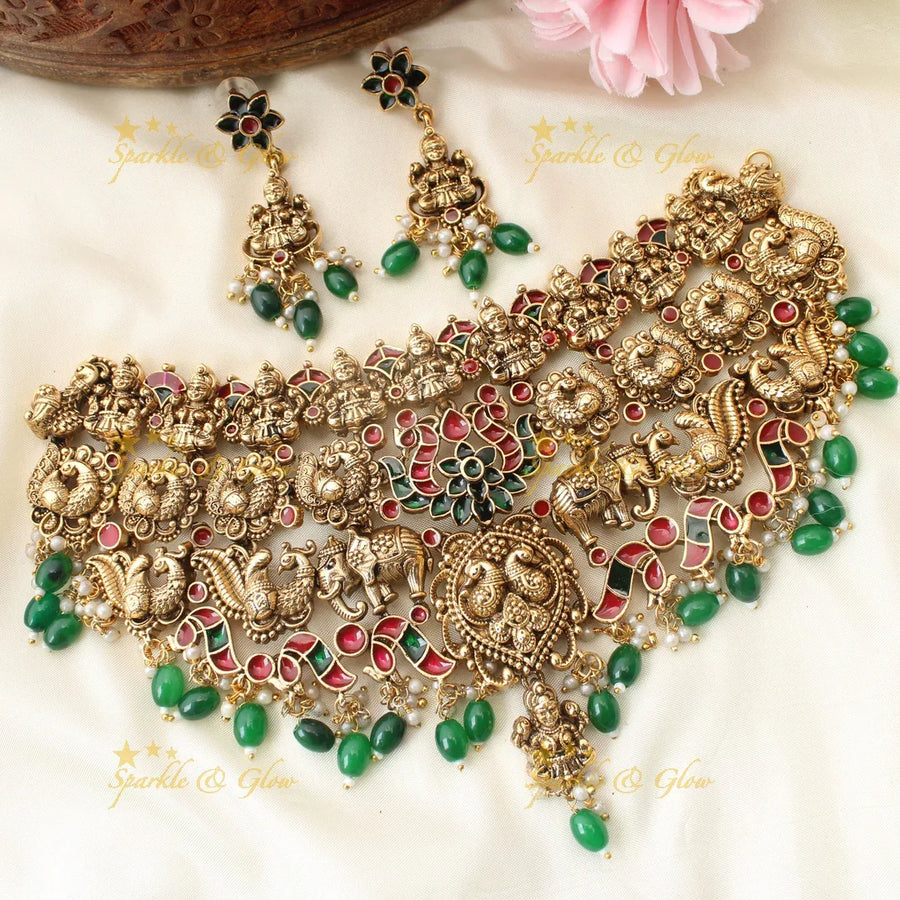 Gold Lakshmi Elephant & Peacock Necklace with Green Beads