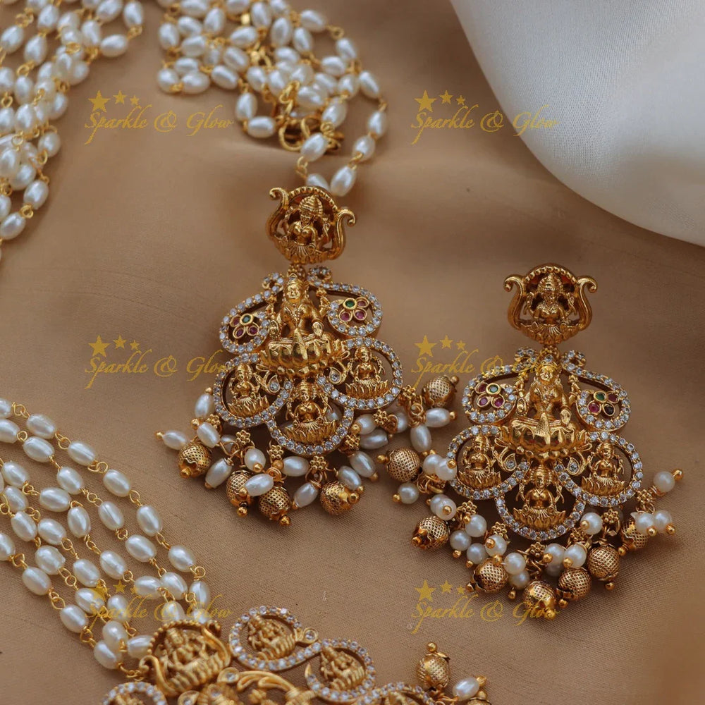 Paired with the haram are exquisite matching earrings, mirroring the same divine theme. The Lakshmi stud earrings feature layered floral scrolls, beaded jhumka hangings, and mini temple bells, adding movement and sparkle. Whether worn together or separately, the set is versatile and eye-catching.