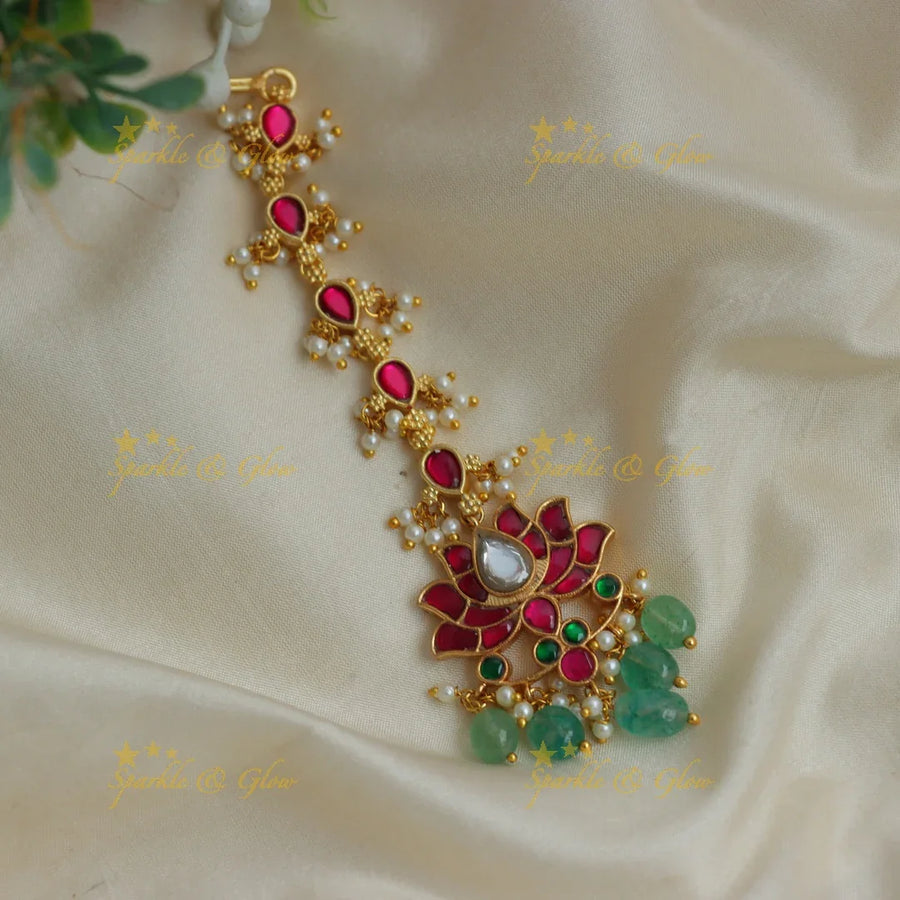 Lotus Floral Kundan Maang Tikka, Green Beads