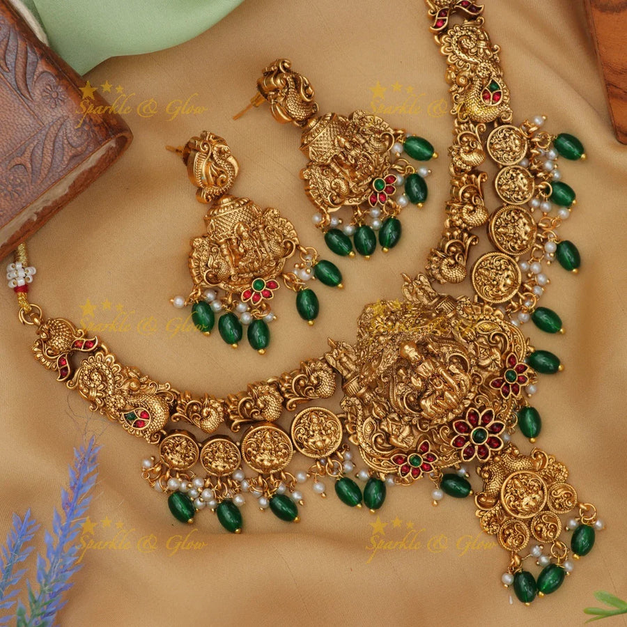 Elegant Lakshmi Peacock Floral carved short necklace with Green beads