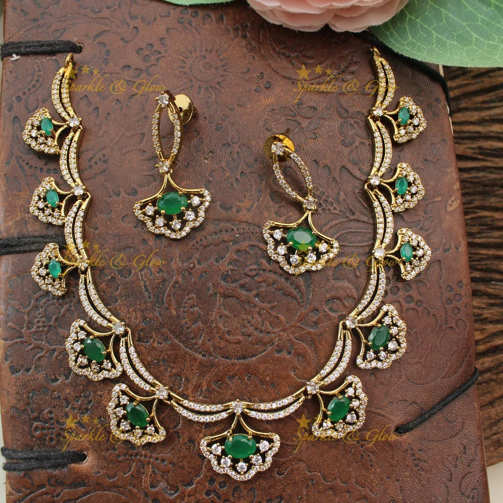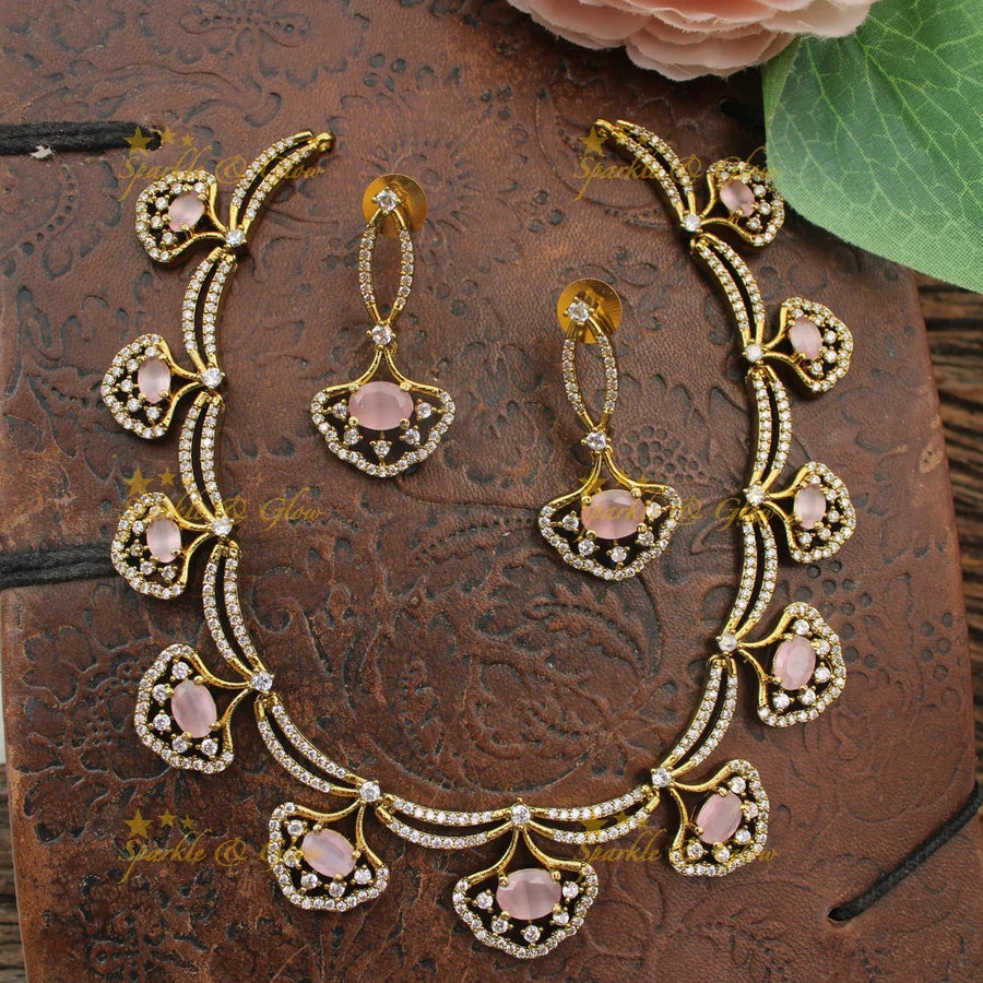 Embrace elegance with our AD Leaf Floral Zigzag Necklace, a masterpiece of intricate design and festive allure. This chic short necklace features a stunning zigzag pattern adorned with shimmering American diamonds, capturing the essence of luxury and sophistication. The delicate floral motifs embellished with a soft pink hue and gold finish offer a timeless charm, perfect for weddings and festive occasions.