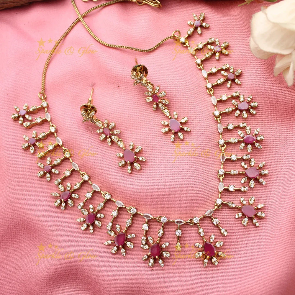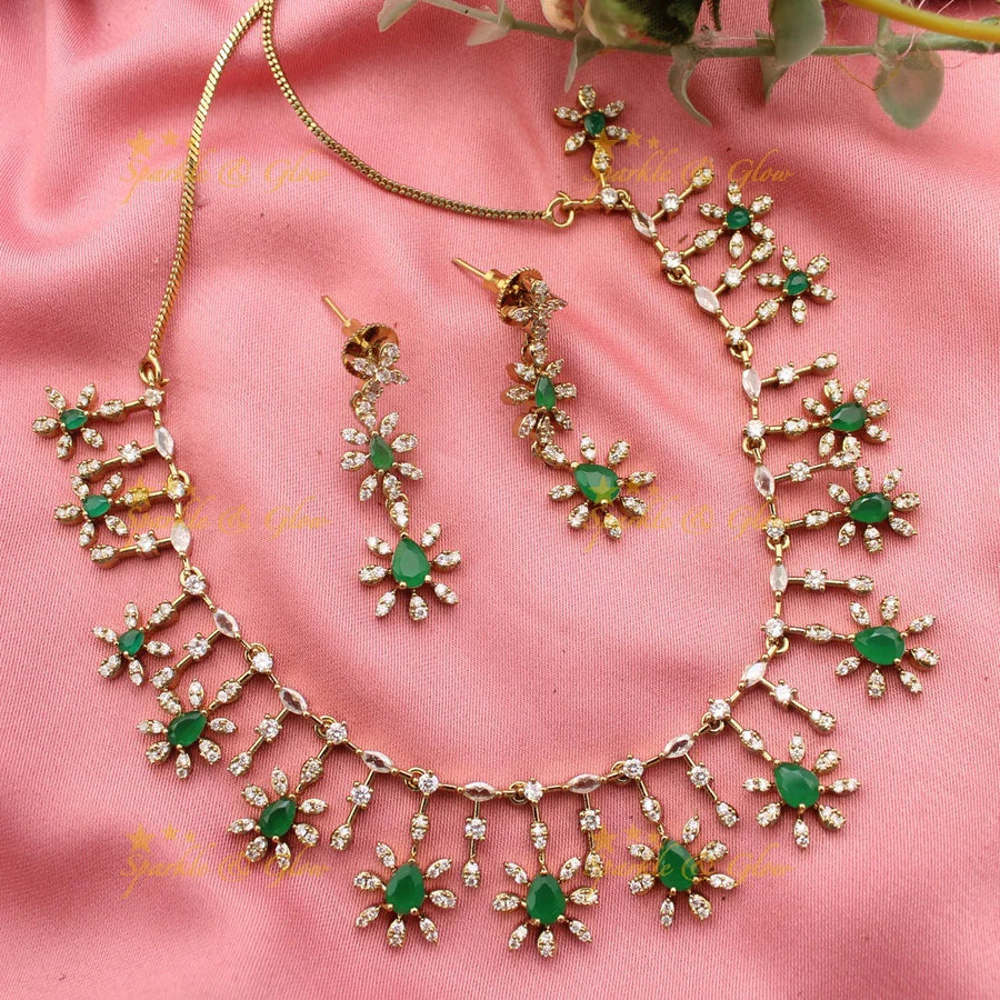 Introducing the exquisite American Diamond Star Floral Necklace, a perfect blend of elegance and festivity. This stunning short necklace features a sparkling array of American diamonds, intricately arranged in a star floral motif that captures the essence of timeless beauty. The dazzling stones are set against a rich gold finish, making it an ideal accessory for festive occasions, weddings, or temple visits.