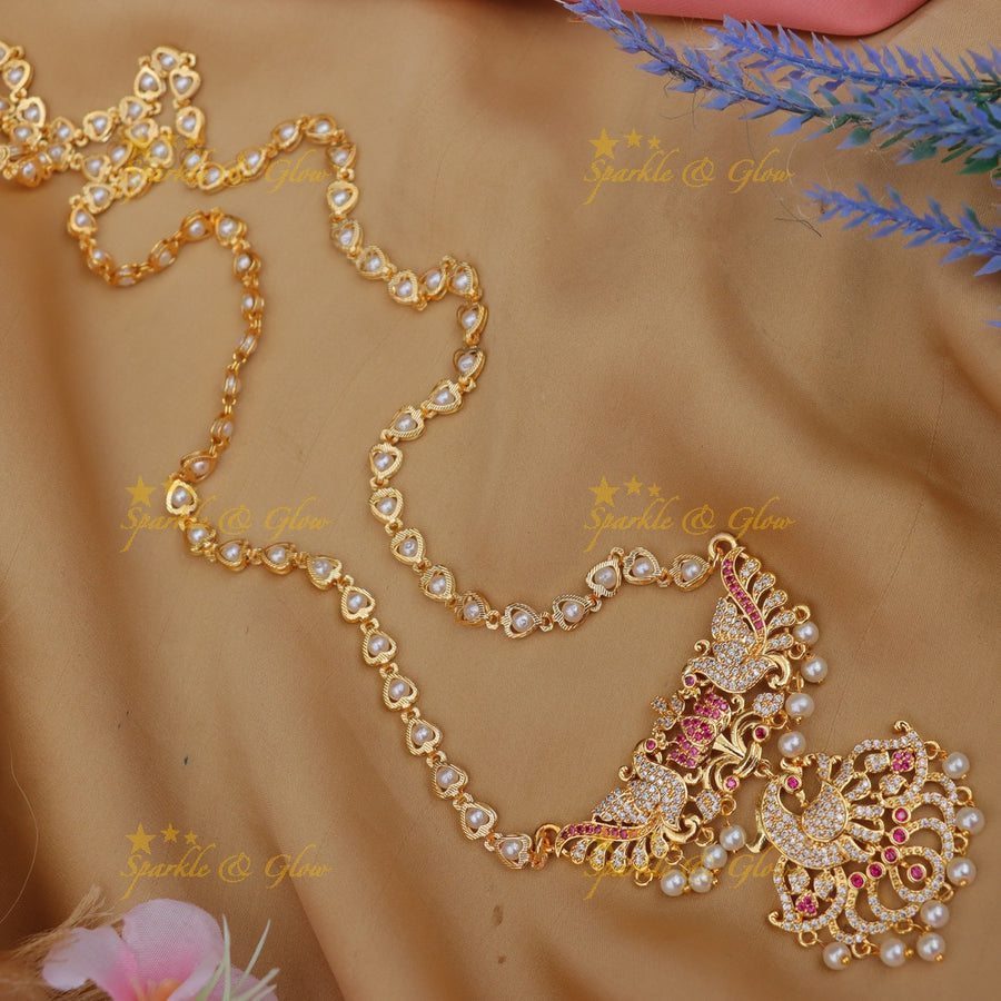 Our skilled artisans have crafted this masterpiece keeping in mind the dynamic movements and vibrant hues of the peacock, rendering a piece that is both majestic and fashionable. It rests gracefully on the wearer, enhancing your silhouette with its elongated design, ideal for pairing with long necklaces or temple jewellery for a layered look.
