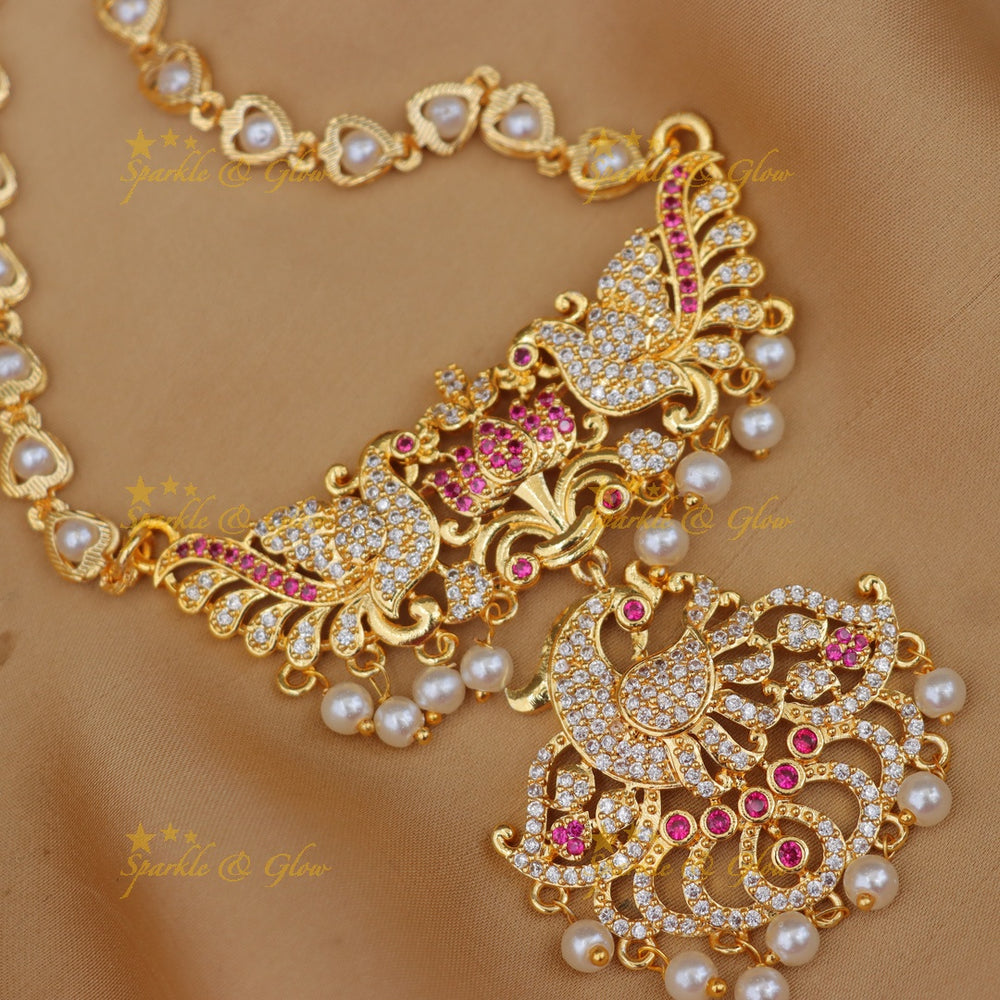 Transform your jewellery collection with this Dancing Peacock Gold Necklace, a must-have for discerning fashion enthusiasts. Celebrate life’s grandest occasions in style with our finest artistry. Remember, every sparkle speaks of unparalleled quality and design—our promise at Sparkle & Glow.