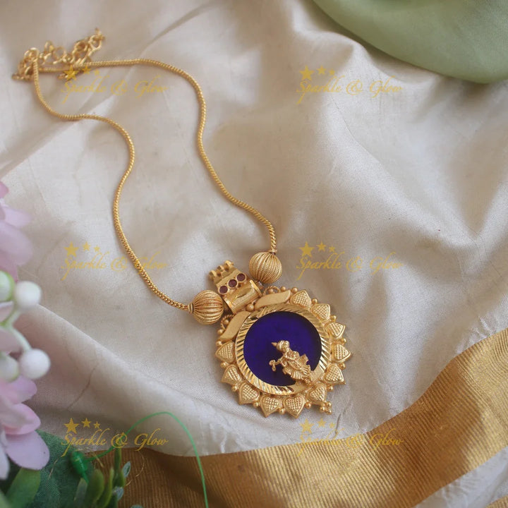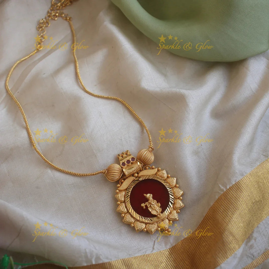 Adorn yourself with our exquisite Elegant Red Krishna Idol Pendant Necklace, a statement piece that radiates divine elegance. This necklace features a beautifully crafted Krishna idol set against a rich red backdrop, symbolizing passion and devotion. Encircled by intricate gold motifs and delicate beads, this piece is a testament to timeless artistry.