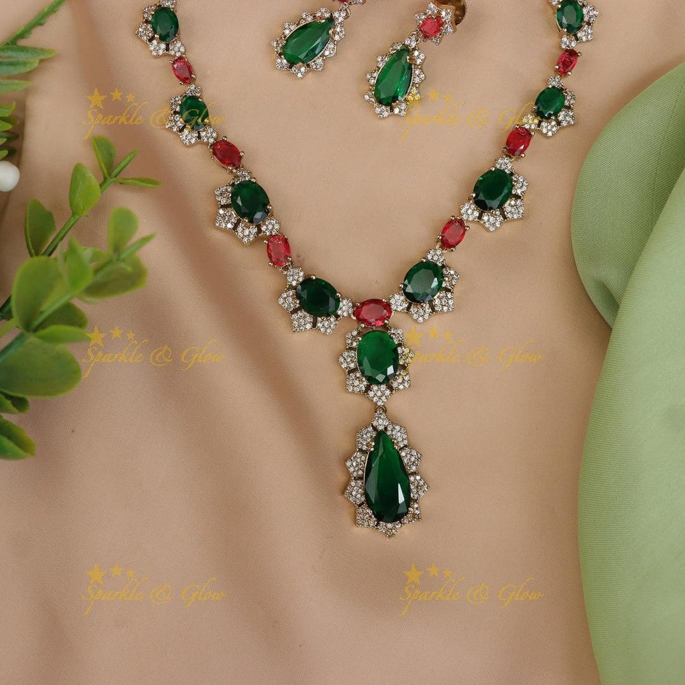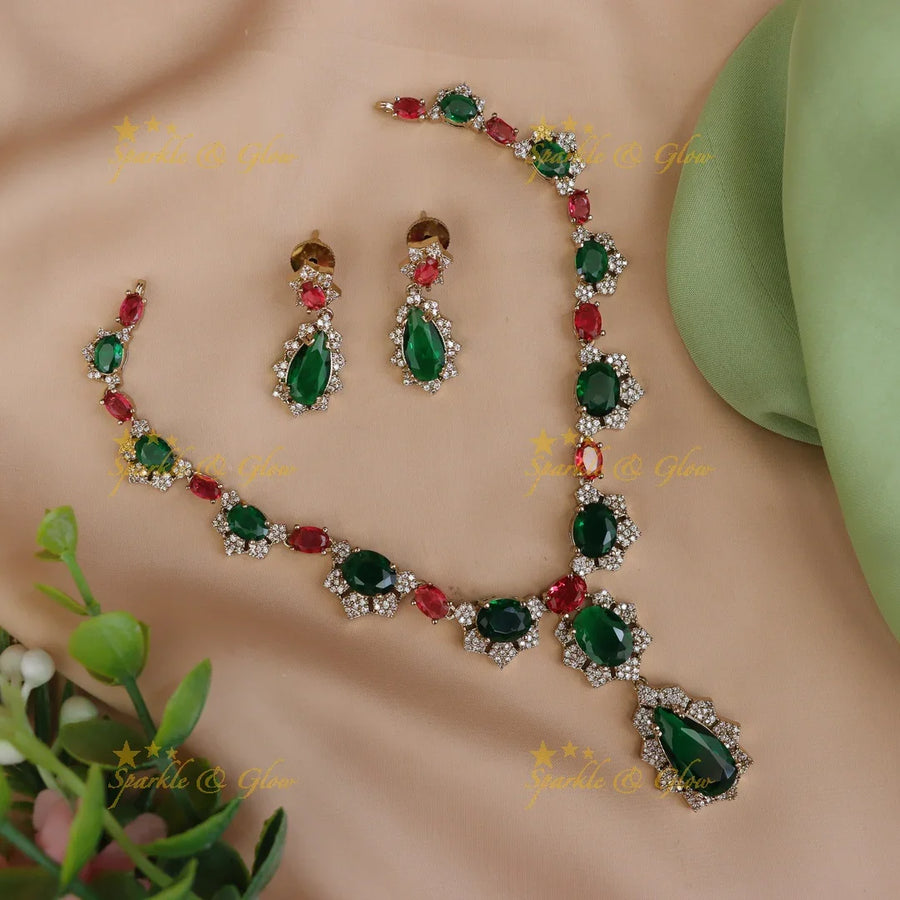 Paired with matching earrings, the necklace set complements both traditional and contemporary outfits. The elegant design features a combination of vibrant green and ruby-colored stones, interspersed with glistening American diamonds to create a piece of art that you will treasure.