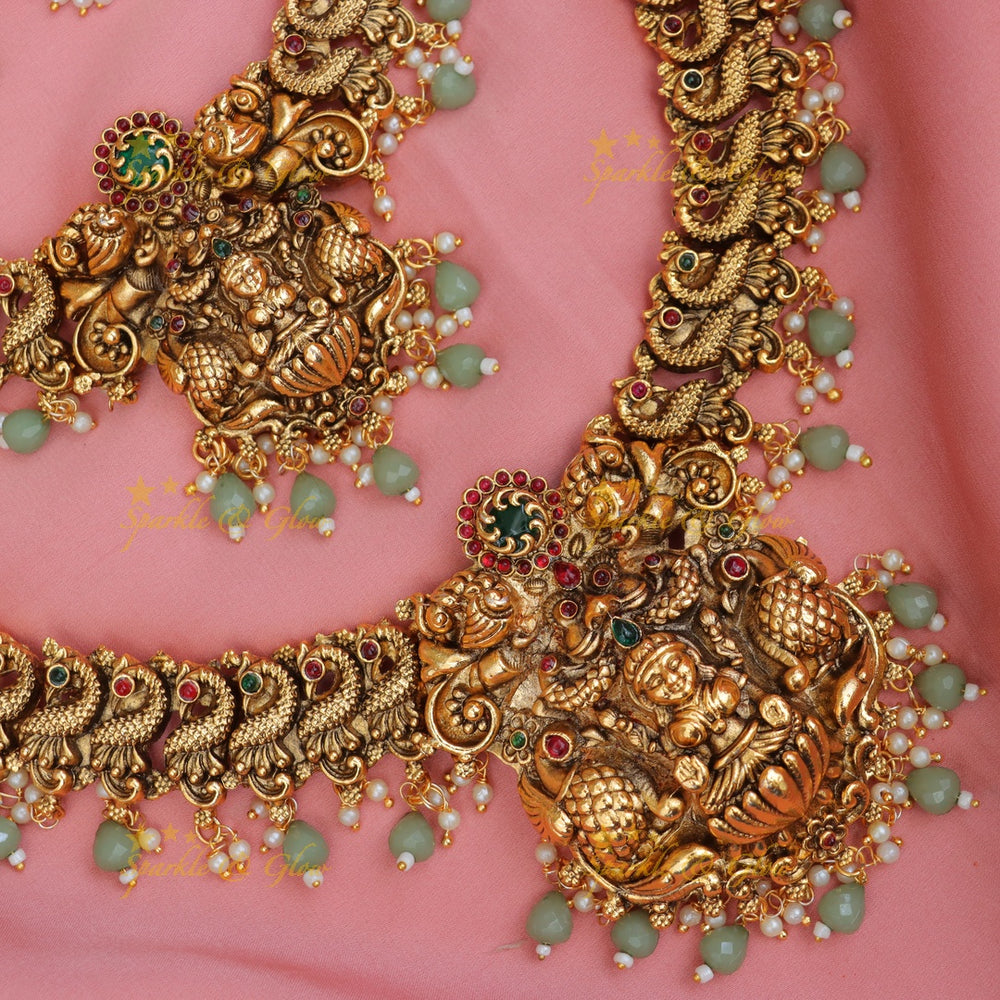 This stunning set features a necklace and matching earrings intricately crafted to depict revered temple idols, showcasing exquisite details and an antique gold finish that's sure to captivate. The ornate design is embellished with sparkling stones and delicate pearls, offering an opulent look perfect for brides.