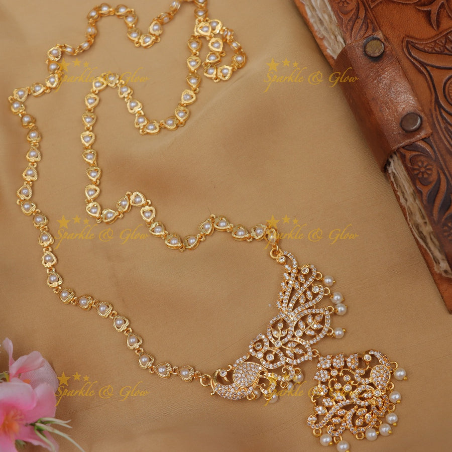 Step into the world of elegance with our Peacock Mango Necklace, a masterpiece crafted to offer timeless beauty for your festive occasions. This exquisite long necklace, designed with intricate peacock and mango motifs, is a true testament to the artistry of traditional Indian jewellery. Ideal for weddings and festive gatherings, it’s the latest addition to our new arrivals.