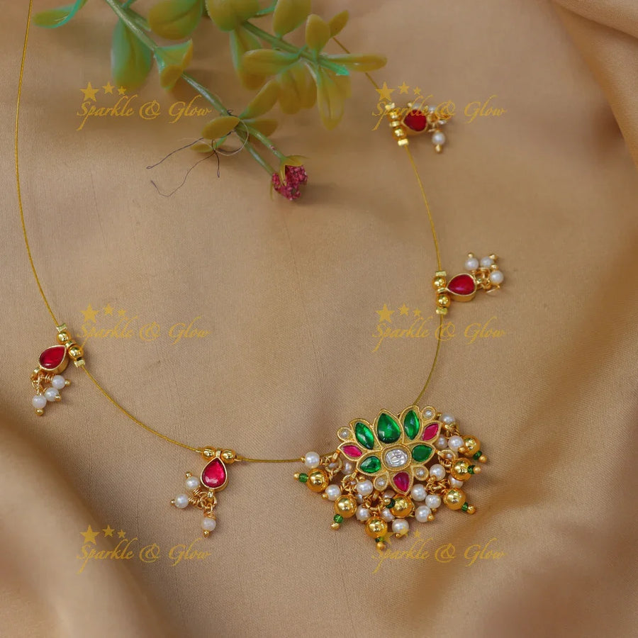 Set on a delicate invisible golden thread, this necklace exudes grace and luxury with every element. The centerpiece boasts a grand lotus motif, symbolic of purity and prosperity in Indian culture. It is beautifully accented with hand-set green, red, and white Kundan stones that reflect traditional charm and festive allure. The play of multicolour enamelling seen across the variants adds a lively and rich palette to your ethnic look.